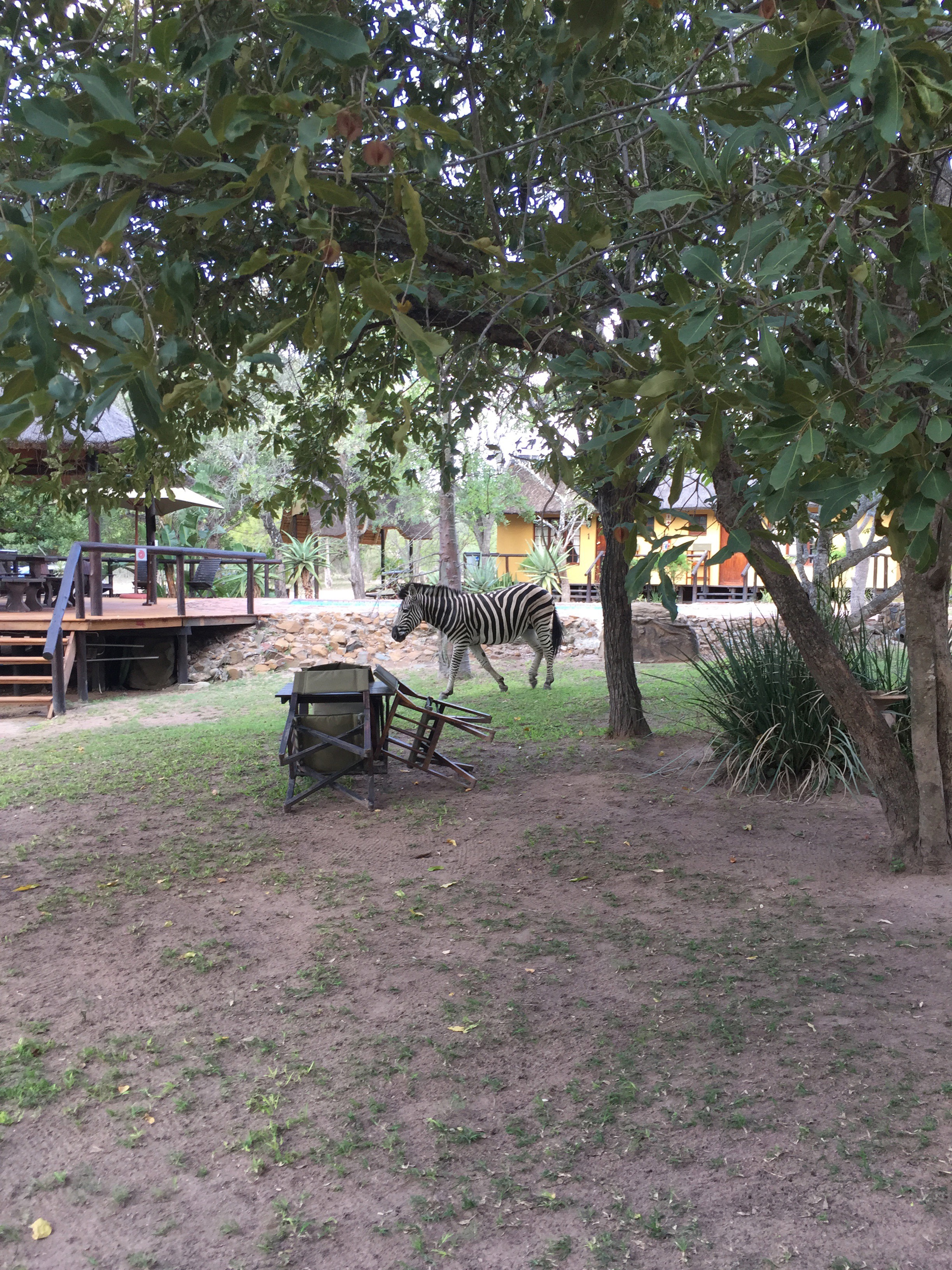 Il n’est pas rare de voir des animaux sauvages dans le jardin du lodge. À peine arrivées à notre hébergement dans le parc national Kruger, nous tombons déjà sur un zèbre venu s’abreuver à la piscine.