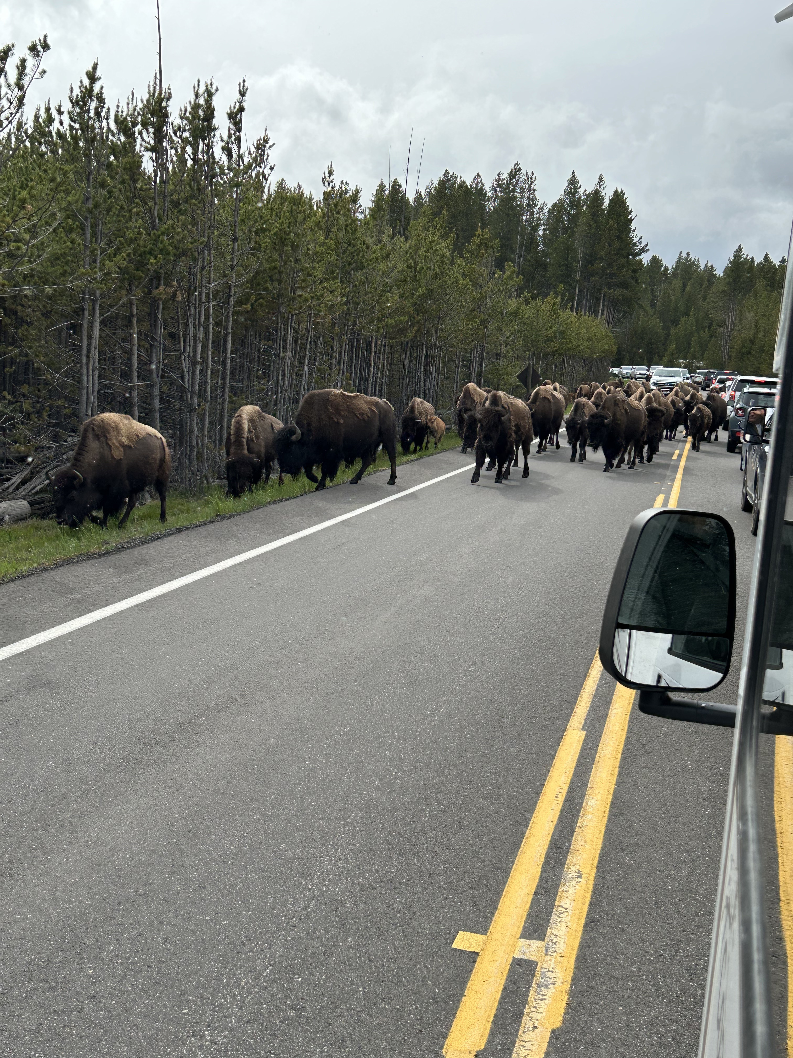 La circulation s’arrête... un grand troupeau de bisons traverse la route !