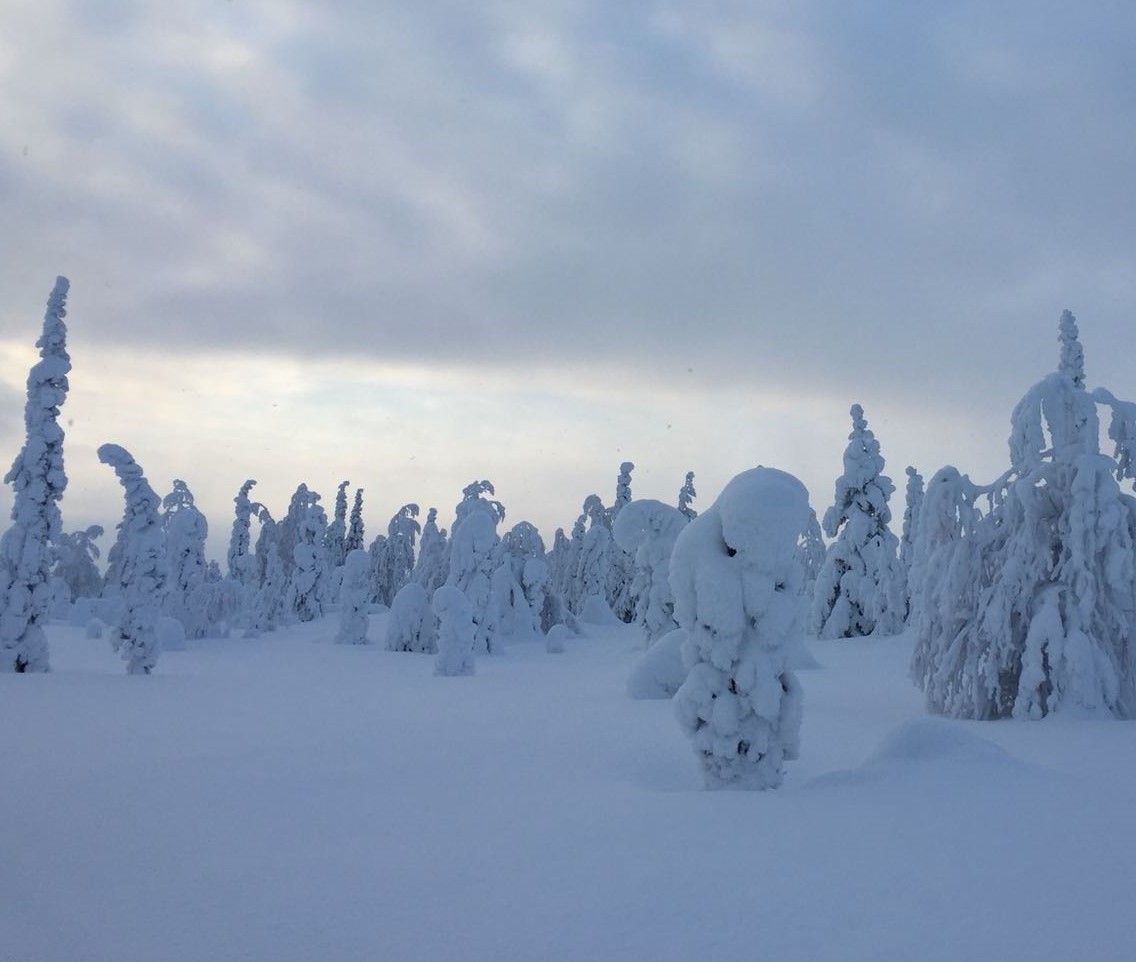 Chaudement emmitouflés, nous explorons le lendemain le magnifique paysage enneigé. De décembre à janvier, les jours sont courts et c’est la période la plus sombre en Laponie. Le jour se lève vers dix heures et le crépuscule commence déjà à poindre avant quatre heures de l’après-midi. -