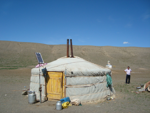 Un panneau solaire fournit aux nomades le courant nécessaire pour alimenter le téléviseur et l’ampoule. Sur le toit de tissu, du fromage blanc produit à base de lait de jument est mis à sécher en prévision de l’hiver.