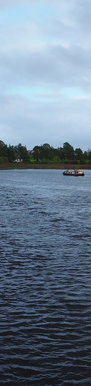 Bei der Weiterfahrt hängt jeder seinen Gedanken nach, am Busfenster ziehen Wiesen vorbei, vereinzelt Bäume, Ortsschilder. Wir erreichen Carrick on Shannon. Den Rucksack geschultert gehe ich den Hotelgang entlang zum Zimmer. Es dauert jedoch, die Wände sind tapeziert von Zeitungsausschnitten, Fotografien und Zeitdokumenten. Fast wie in einem Museum. Das Kaminzimmer lockt zu einer Pause – die dunklen Polstersessel sehen bequem aus und das Feuer knistert einladend. Doch die die unbekannten Gassen rufen. Ich finde das Zimmer in dem verwinkelten Hotel doch noch, und nach raschem Frischmachen flaniere ich ein wenig durch die Stadt am Shannon, dem längsten Fluss des Landes.