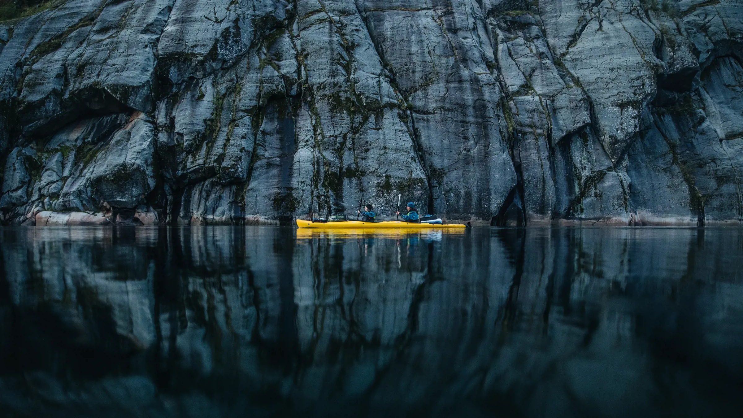 Unsere Kajaks leuchten als rote, gelbe oder orange Striche auf dem dunklen Meer. Wir paddeln aus der Bucht hinaus auf einen breiten Fjord. Weit am linken Horizont erhebt sich die Küste der Vesterålen. Am rechten Ufer ragen schwarze Berge direkt aus dem Meer auf. Ein Wasserfall stürzt die Klippen hinunter.