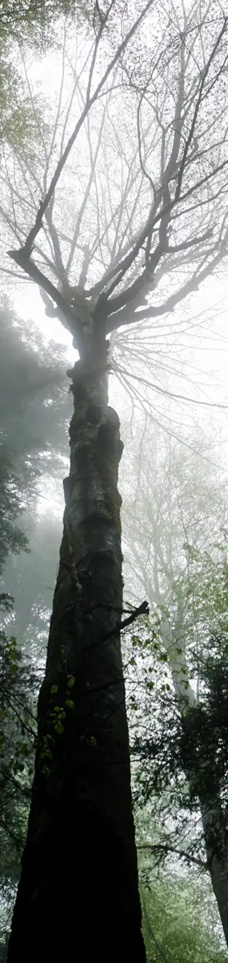 Je höher wir steigen, desto gespenstischer wird es. Ineinander verwachsene Bäume, schwarze Baumskelette und mit Moos bewachsene Findlinge tauchen aus dem Nebel auf. Die Feuchtigkeit tropft von den Blättern auf unsere Köpfe, der Weg ist rutschig. Es riecht nach Bärlauch. Ich spüre die erfrischende Wirkung des Waldbades auf meinen Körper und sammle neue Kräfte für den letzten Anstieg.