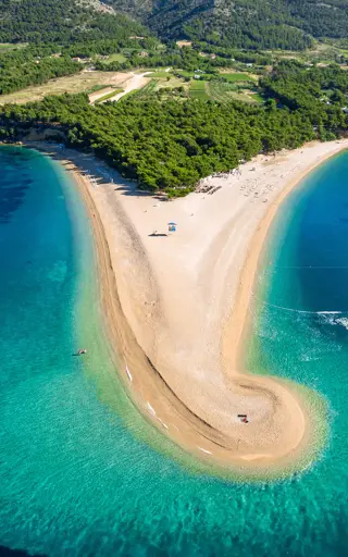 Der weltweit einzigartige Zlatni Rat Strand besticht durch seine unverwechselbare Form. Wie eine sich ständig verändernde Zunge erstreckt er sich fast einen halben Kilometer ins Meer hinein. Die Wellen und Meeresströmungen formen kontinuierlich die Spitze dieses berühmten Strandes, der jedes Jahr etwas länger wird, wie Messungen belegen.