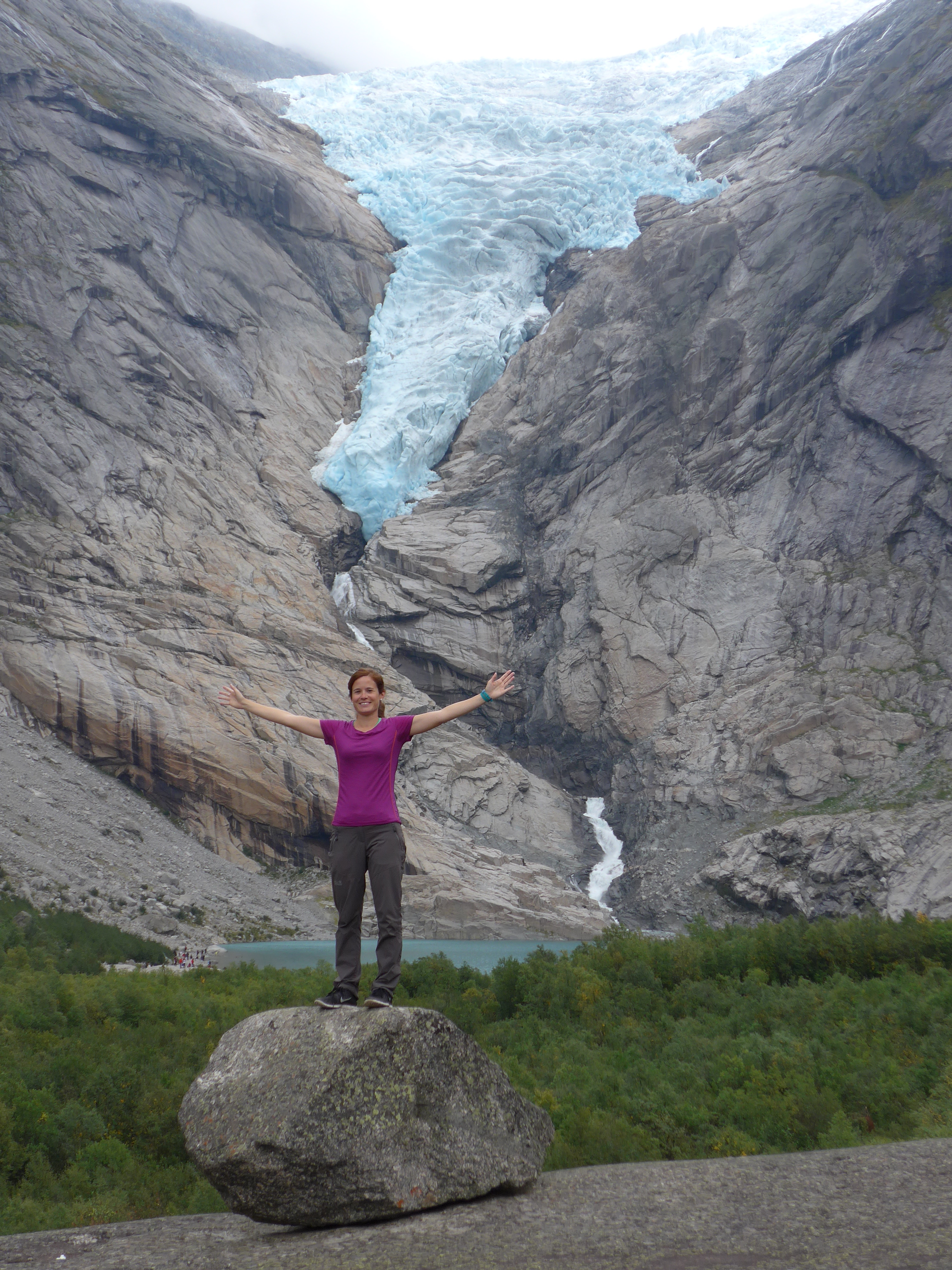 Da der Nordfjord auch von Kreuzfahrtschiffen angefahren wird, lohnt es sich früh zum Briksdalsbreen aufzubrechen. Den Blick zum Gletscher kann man sich mit einer Fahrt in einem "Trollwagen" noch verkürzen. Wir wählen den gemütlichen Wanderweg daneben und geniessen den Aussichtspunkt für uns alleine.
