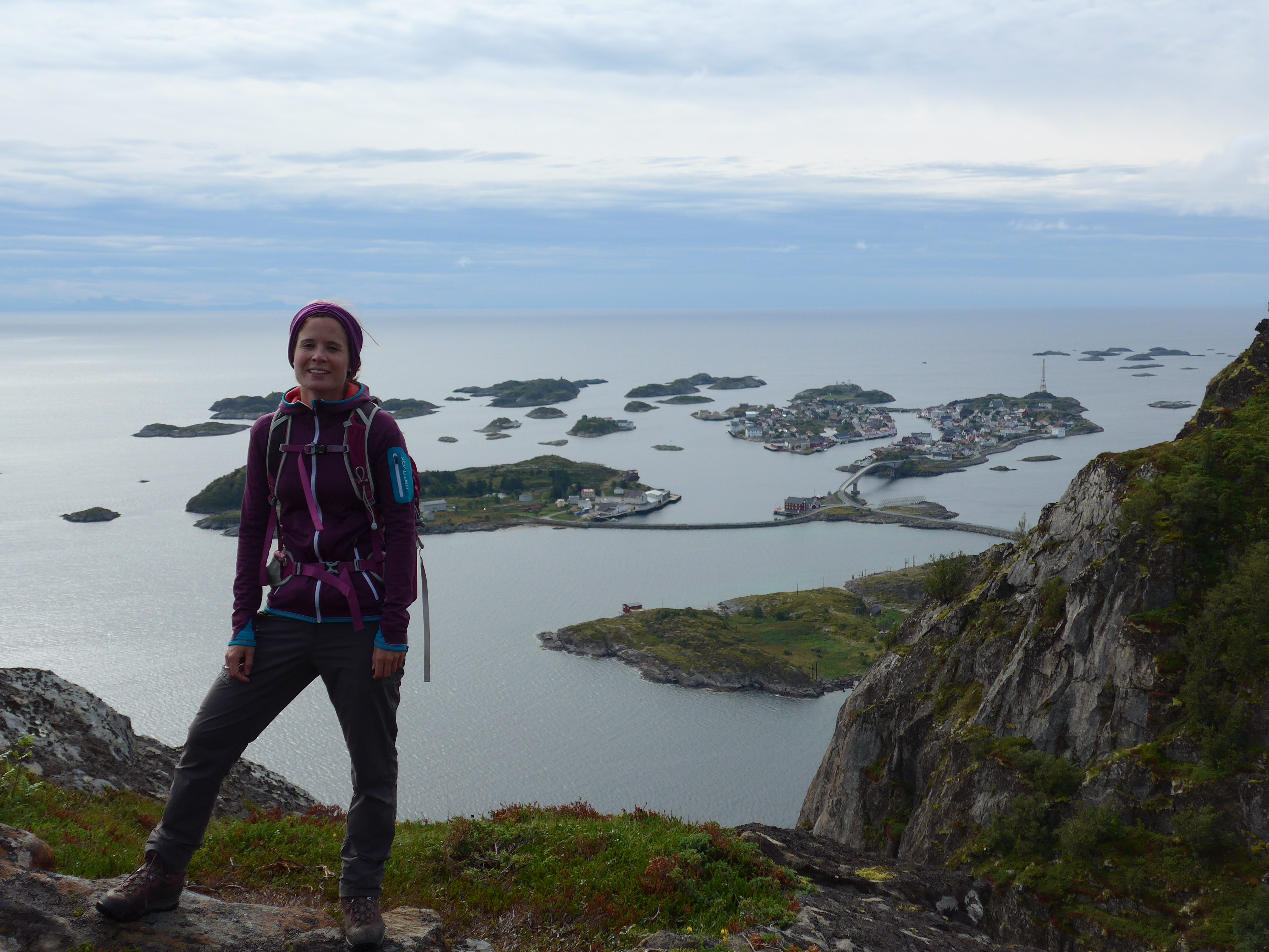 Sofort merken wir, dass hier das Wetter im Minutentakt ändern kann. So nutzen wir die Trockenphase am ersten Morgen sogleich für einen Aufstieg mit Weitblick übers Fischerdorf Henningsvaer. Typisch für Wanderwege auf den Lofoten ist der oft steile Anstieg mit einzelnen Kletterpartien in ziemlich feuchtem Gelände. Dafür wird man sehr schnell mit einer super Aussicht belohnt.