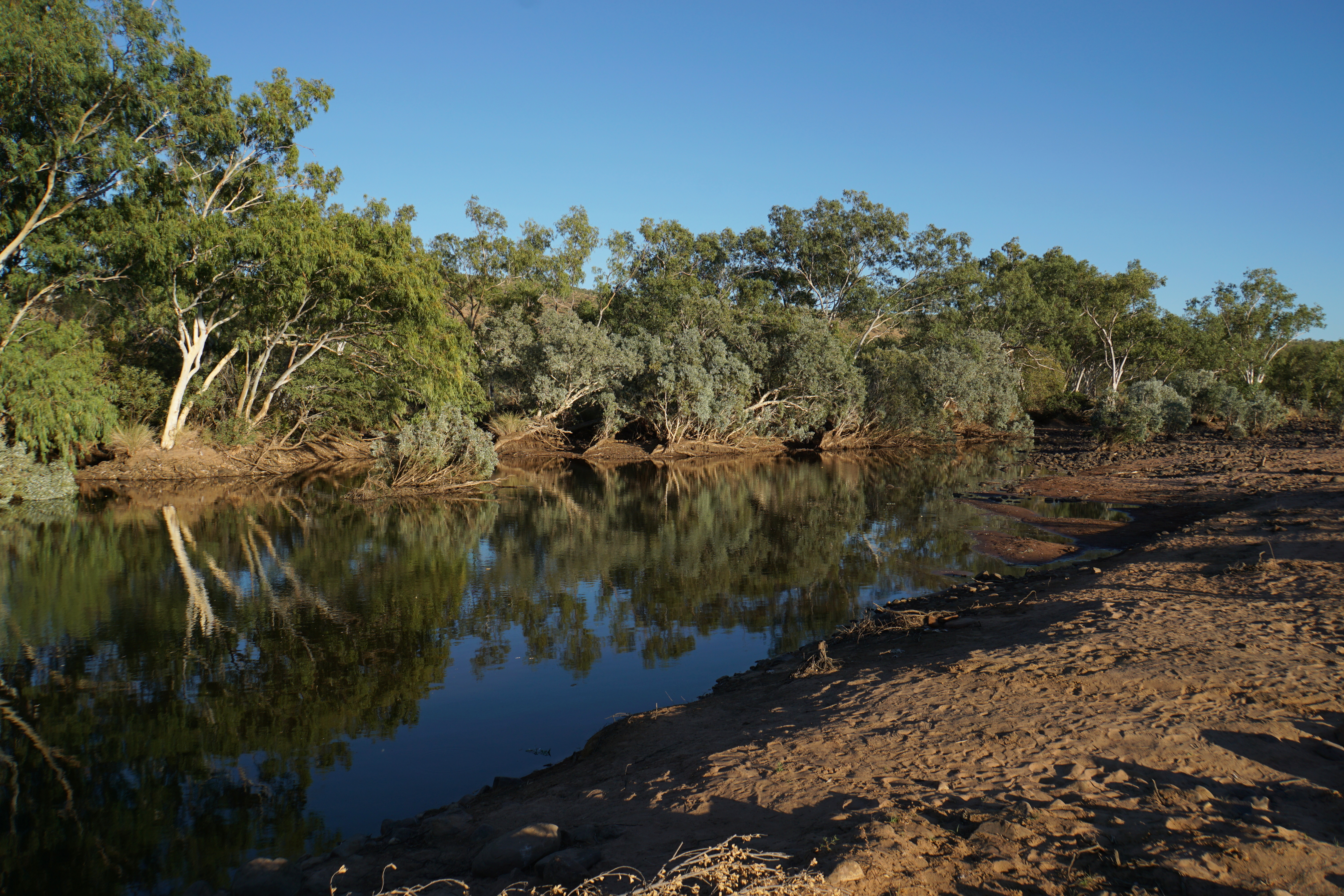 Im warmen Licht der Nachmittagssonne stauben wir der langgezogenen Cockburn Range entlang, einer bis zu 600 Meter hohen malerischen Gebirgskette. Immer wieder queren Wasserläufe die Gibb River Road. Ob und wie viel Wasser fliesst, ist vorwiegend von der Jahreszeit sowie der Niederschlagsmenge abhängig.