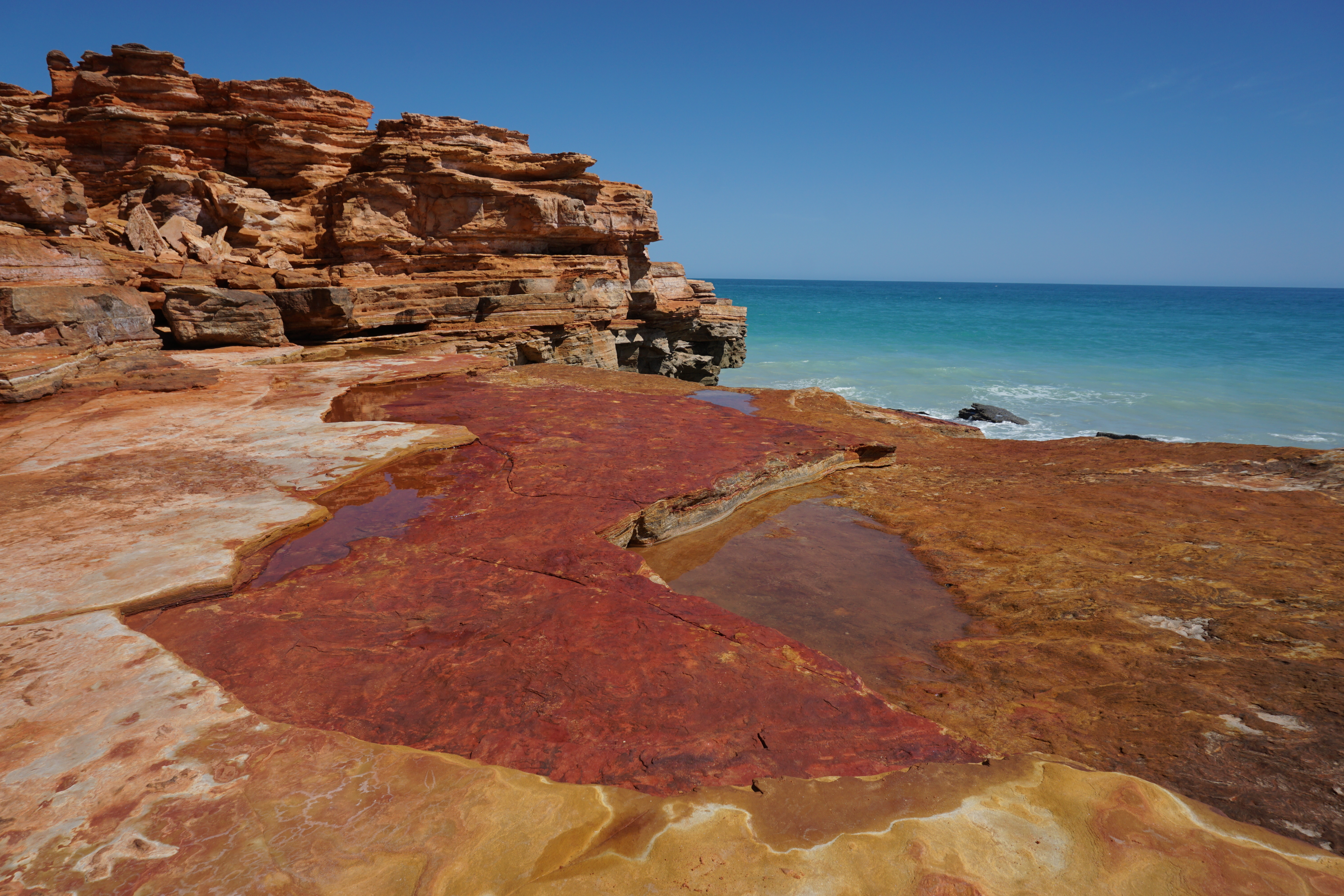 Der ausserhalb der lebendigen Stadt gelegene Gantheaume Point an der südlichen Landspitze ist eine Wucht. An gewissen Stellen wirkt die natürlich gefärbte Felslandschaft wie ein gemaltes Kunstwerk. Tief beeindruckt von den Wundern der Natur, verabschieden wir uns von der Region Kimberley und ziehen glückselig weiter...