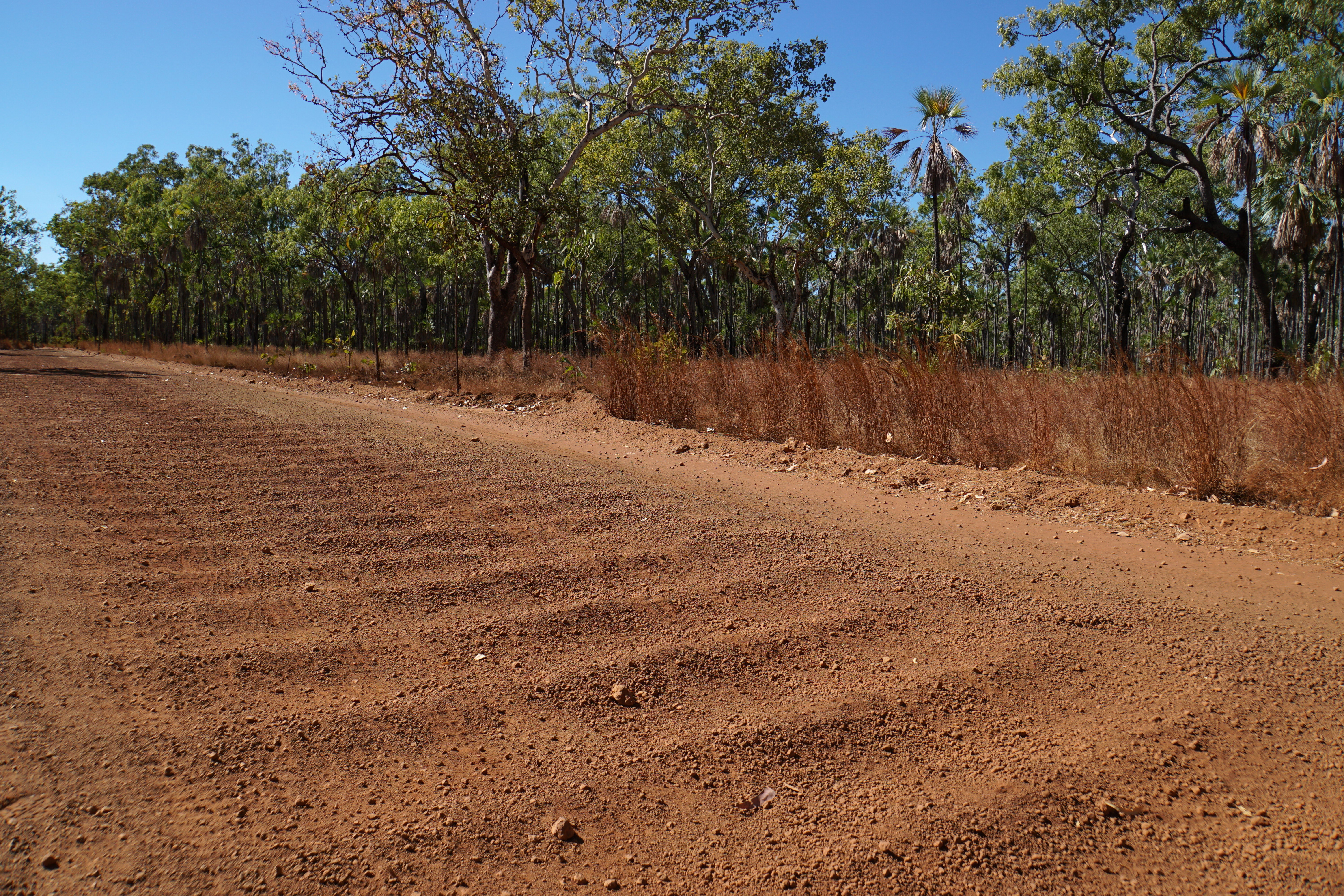 Lichter Wald mit australischen Schirmpalmen überzieht das Mitchell Plateau. Meistens gleitet mein Blick jedoch nicht in die Weite, sondern wie derjenige des Autolenkers auf die entsetzliche Waschbrettpiste. Zermürbende Querrillen übernehmen beinahe das Zepter, Karosserie und Innenleben vibrieren und scheppern.