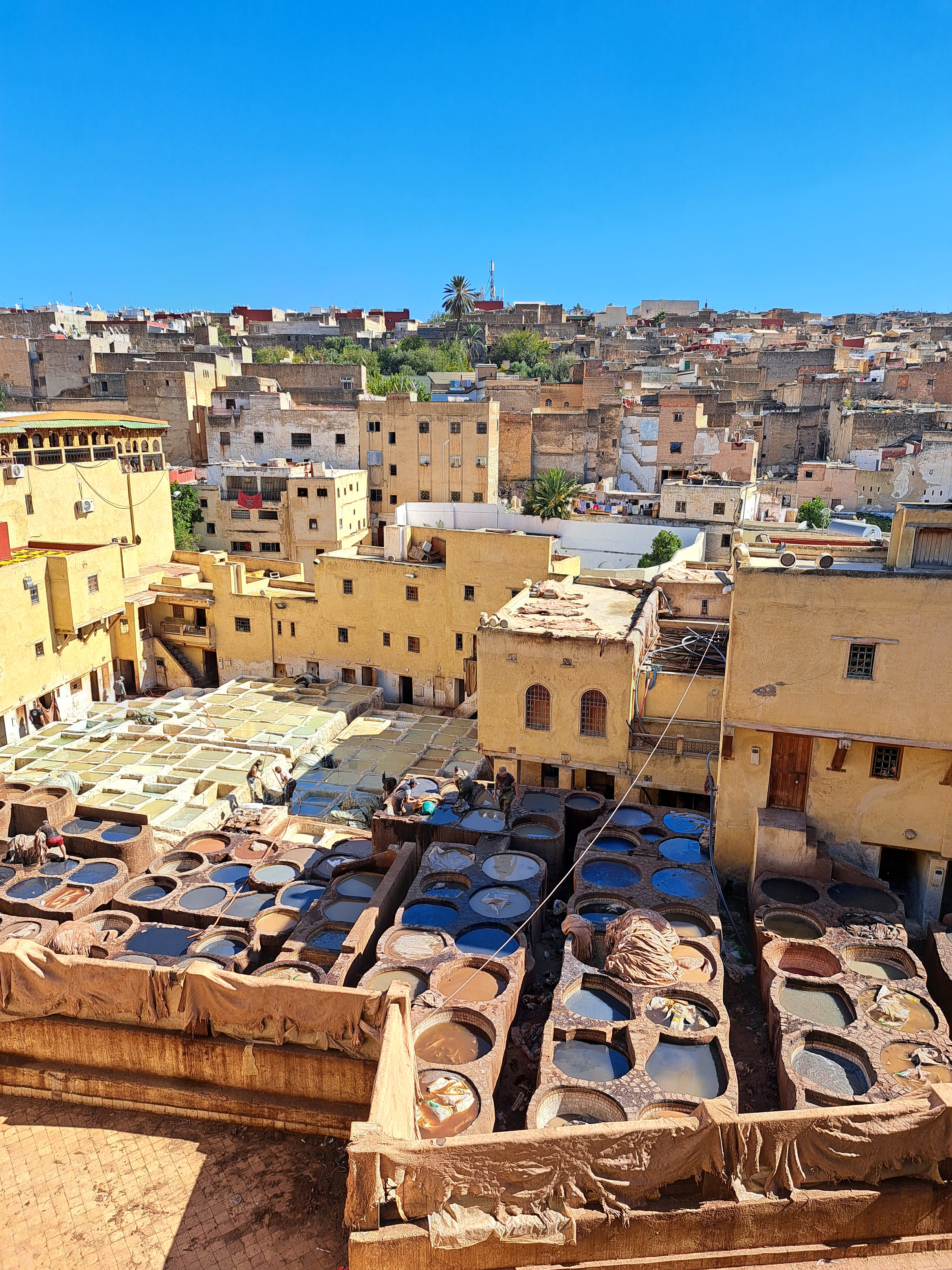 Unser Guide meint, es ist Zeit fürs Mittagessen. Mit diesem Wissen laufe ich ihm hinterher, und er führt uns durch eine kleine Türe. Auf den ersten Blick sieht das nicht nach einem Restaurant aus, und als ich ein Bündel frische Pfefferminze in die Hand gedrückt bekomme, bin ich vollends verwirrt. Ich gehe weiter und lande auf der Terrasse mit dieser Aussicht auf die Ledergerberei von Fès. Nun ja, nicht ganz das, was ich erwartet habe. Gespannt beobachte ich die Arbeiter in der Gerberei und schnuppere ab und zu gerne an der Pfefferminze. Die braucht es auch – bei dem Geruch!