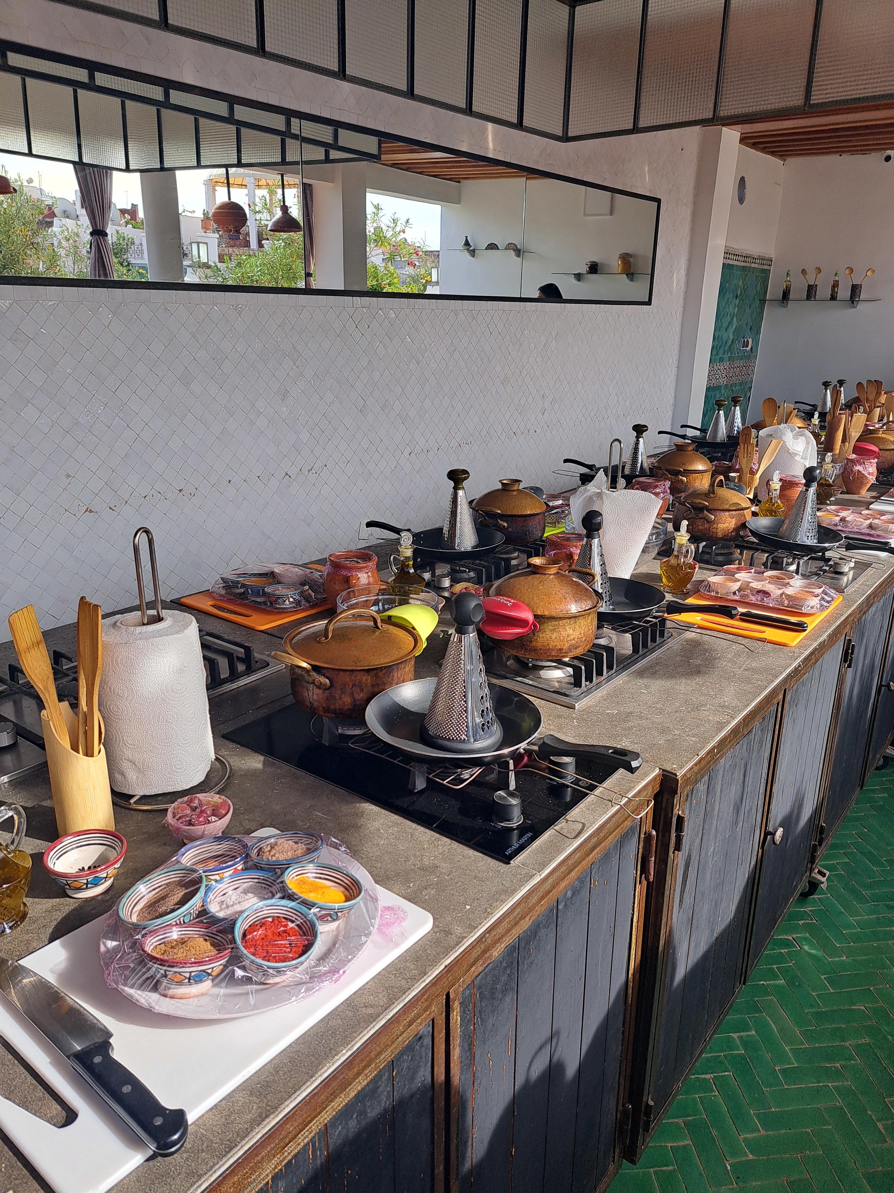 In unserem Riad in Fès kann man einen Kochkurs machen. Auf der wunderschönen Dachterrasse ist die Küche eingerichtet. So macht Kochen noch mehr Spass! Die Kursleiterin führt uns mit viel Humor durch die verschiedenen Etappen. Am Schluss geniessen wir die Poulet-Tajine im Innenhof des Riads. Bon appétit!