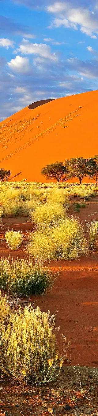 Früh starten wir nach Sesriem und den Sanddünen von Sossusvlei. Wir erklimmen eine der höchsten Dünen und fahren mit einem 4×4-Fahrzeug zum Deadvlei, wo wir die roten Dünen und weisse Salzpfanne erkunden. Nach diesem unvergesslichen Erlebnis besuchen wir den Sesriem Canyon, bevor wir zu unserem Camp zurückkehren.