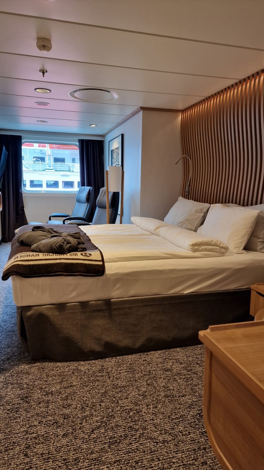 Nach dem Ausflug im Tierra del Fuego Nationalpark geht es zu unserem Schiff, für die Einschiffung. Nach Abholung unseres Materials für die nächsten Tage in der Antarktis (Gummistiefel, Wanderstöcke und Helly Hansen Jacke, welche man sogar mit nach Hause nehmen kann), beziehen wir die Kabine. Das Schiff «Fridtjof Nansen» der Hurtigruten Expedition Flotte verfügt nur über Aussenkabinen, welche wunderschön eingerichtet sind. So kann die Reise nun endlich starten. Vor uns liegen zirka 1000 Kilometer bis in die Antarktis.