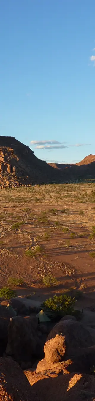 Du spürst am Fuss des Brandbergs, dem grössten Berg Namibias, die bekannten Felsmalereien der San Buschleute auf. Neben Kriegern und Jägern wurde vor 2000-4000 Jahren auch der Wildreichtum der damaligen Zeit auf dem Granit festgehalten. Rund 45'000 Zeichnungen sind über das Bergmassiv verstreut.