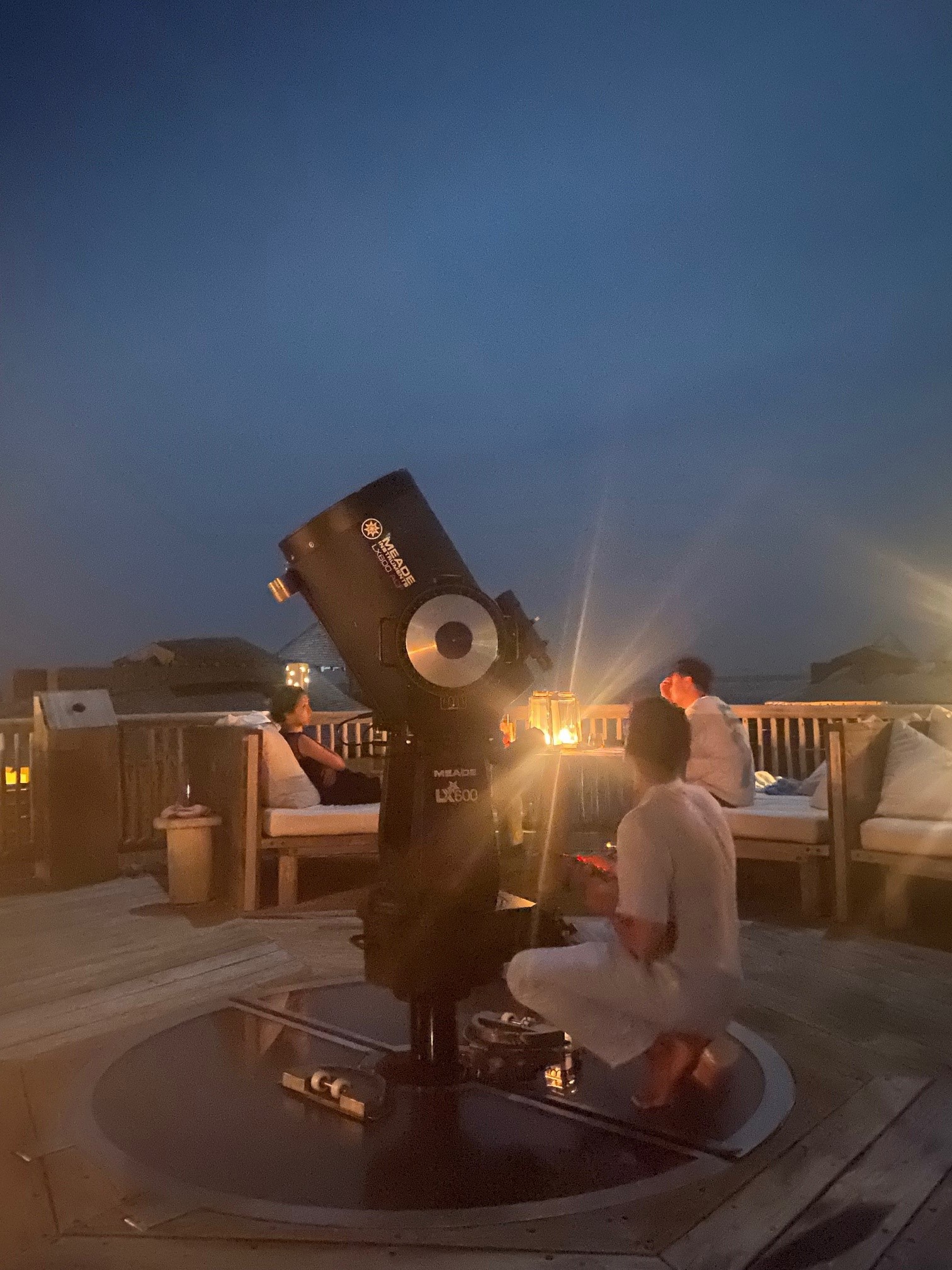 Soneva verfügt über das hochmoderne, von Bond inspirierte Observatorium, wo man ein Abendessen bei Sternenlicht geniessen kann. Während des Essens führt der hauseigene Astronom die Gäste auf eine Reise durch den Nachthimmel und darüber hinaus. Mit einem 16-Zoll-Teleskop, das aus dem Boden ragt, gibt es viel zu sehen, zu besprechen und zu lernen. Wir geniessen den letzten Abend auf dieser Insel in vollen Zügen.