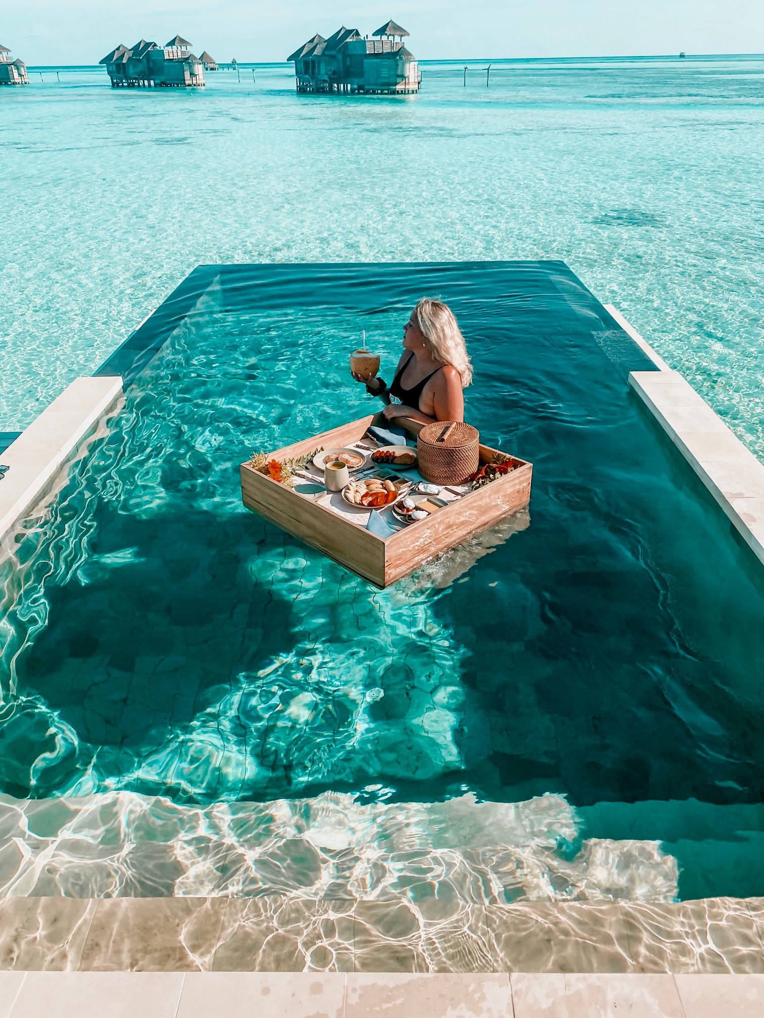 «Floating Breakfast» nennt das Resort sein neues Angebot. Ich hörte immer wieder von dieser Neuheit und denke, es gibt keinen besseren Ort, um es in diesem Resort einmal auszuprobieren. Während im Hintergrund der türkisfarbene Indische Ozean schimmert, kann man sein Frühstück ganz entspannt im Ambiente des eigenen Bungalow einnehmen und gleichzeitig noch ein wenig dabei plantschen.
