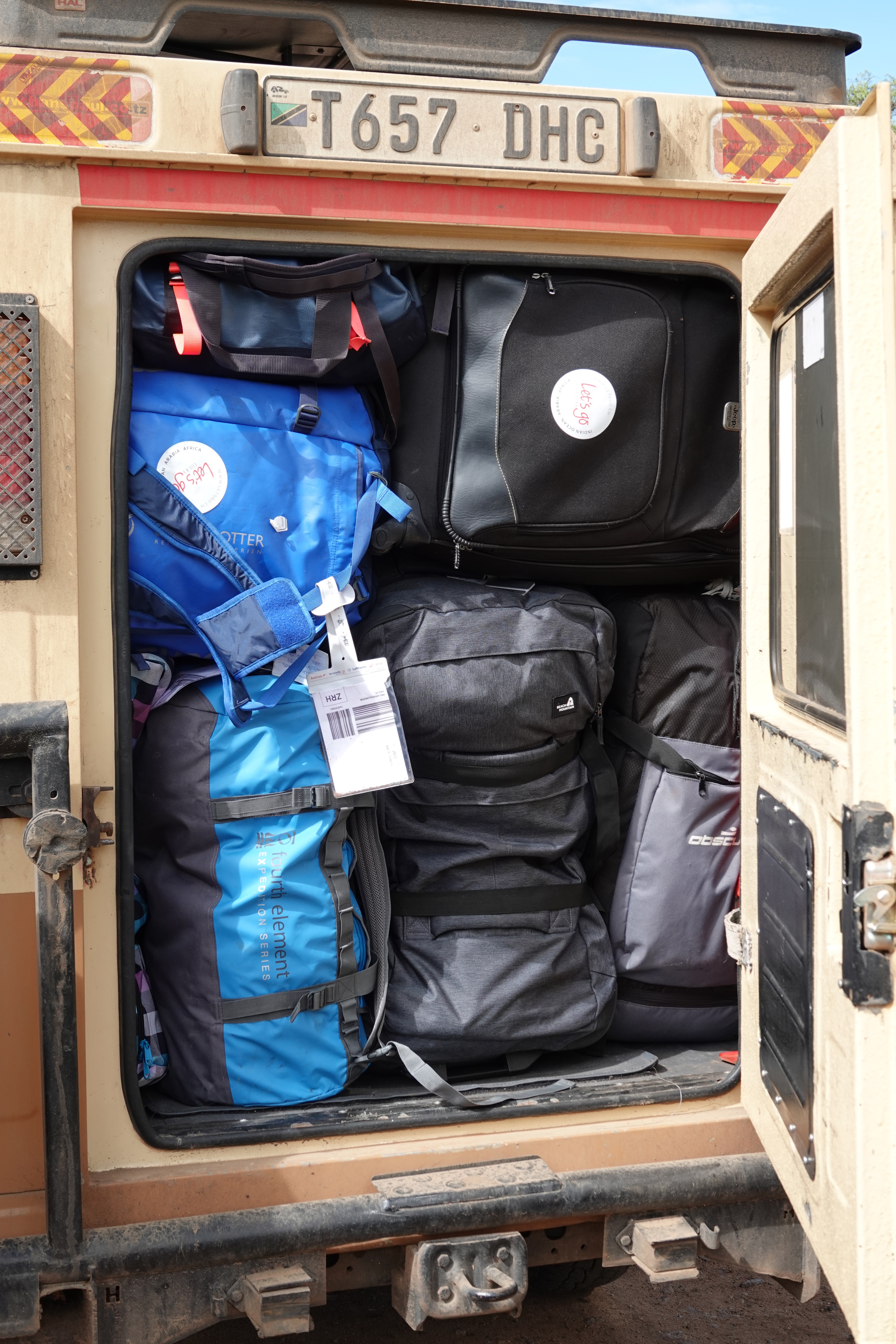 Mir wurde empfohlen, für die Safari eine Reisetasche mitzuführen und keinen Hartschalenkoffer. Beim Verstauen der Gepäckstücke im kleinen Kofferraum unseres Jeeps wurde mir bewusst, warum. Der Gepäckraum ist begrenzt, und unsere Guides spielten täglich Tetris mit unseren Taschen.