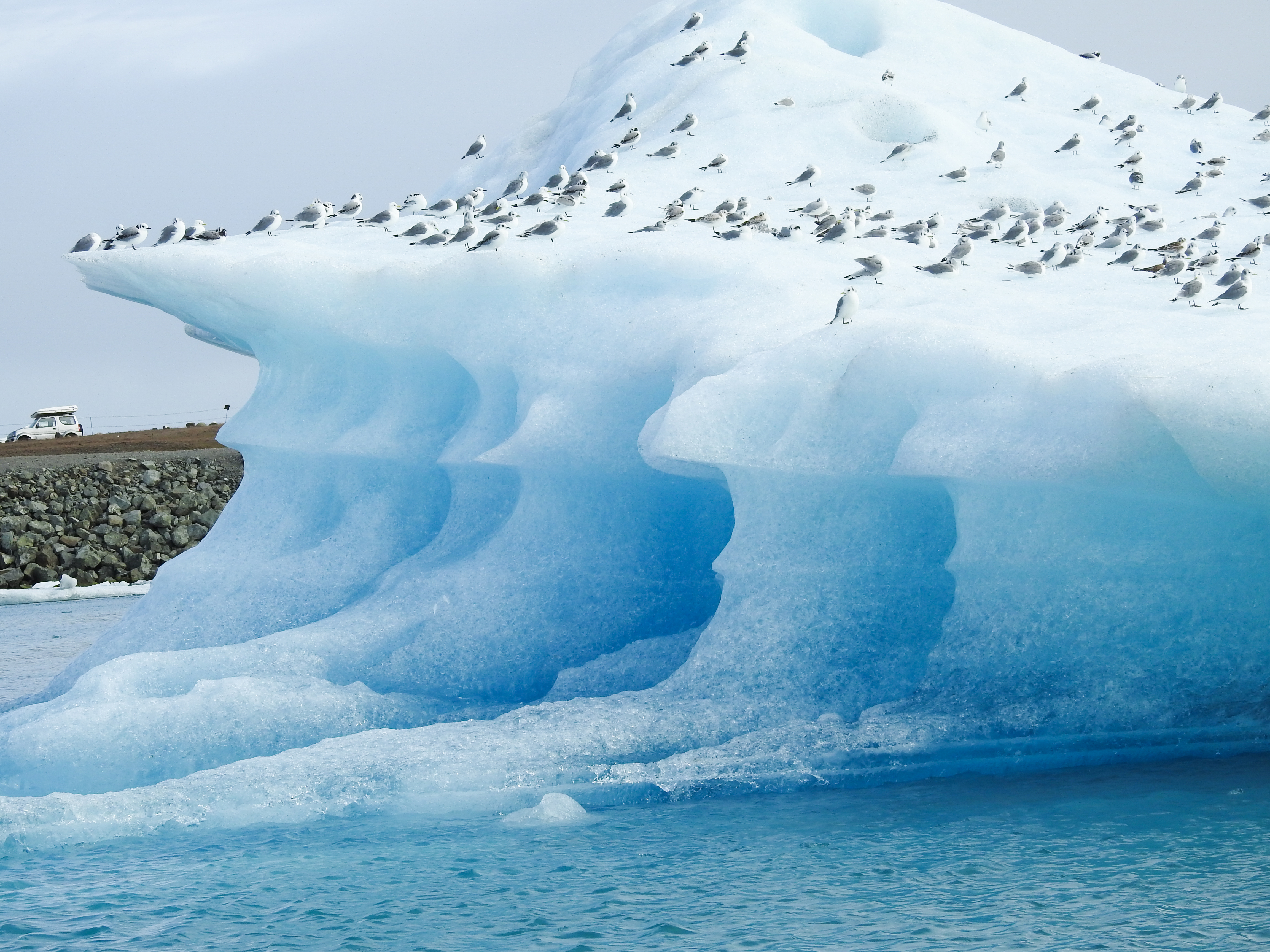 Wer durch Island reist, wird früher oder später an diesem Ort vorbeikommen; so auch wir. Die Gletscherlagune Jökulsárlón liegt am Rand des Gletschers Vatnajökull und ist der bekannteste Gletschersee in Island. Wir unternehmen eine Tour mit einem Amphibienfahrzeug, um den Eisblöcken noch etwas näherzukommen. Im Sommer nisten Möwen am Ufer der Lagune. Während unserer Fahrt haben wir das Glück, einige Robben entdecken zu können.