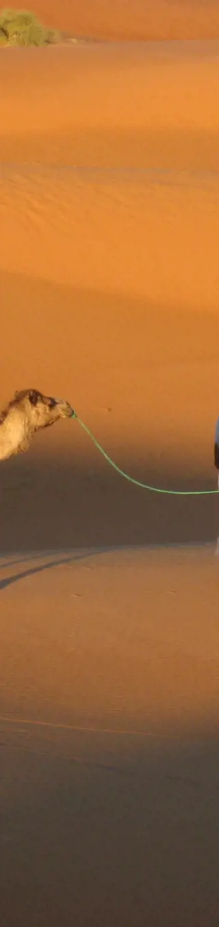 Am Morgen heisst es Abschied nehmen von den Treibern und ihren Tieren. Vorerst auf einer Piste, dann auf guter Strasse fahren wir Richtung Süden. Entlang der unendlich langen Palmenoase des Draa-Tals fahren wir nach Zagora. Hier besteht die Möglichkeit, einen Schesch (Kopf- und Gesichtstuch der Nomaden) zu kaufen. In Ait Isfoul, dem Tor zur Wüste, treffen wir auf unsere Begleitmannschaft und die Kamele. Wir verbringen unsere erste Nacht in der Wüste.