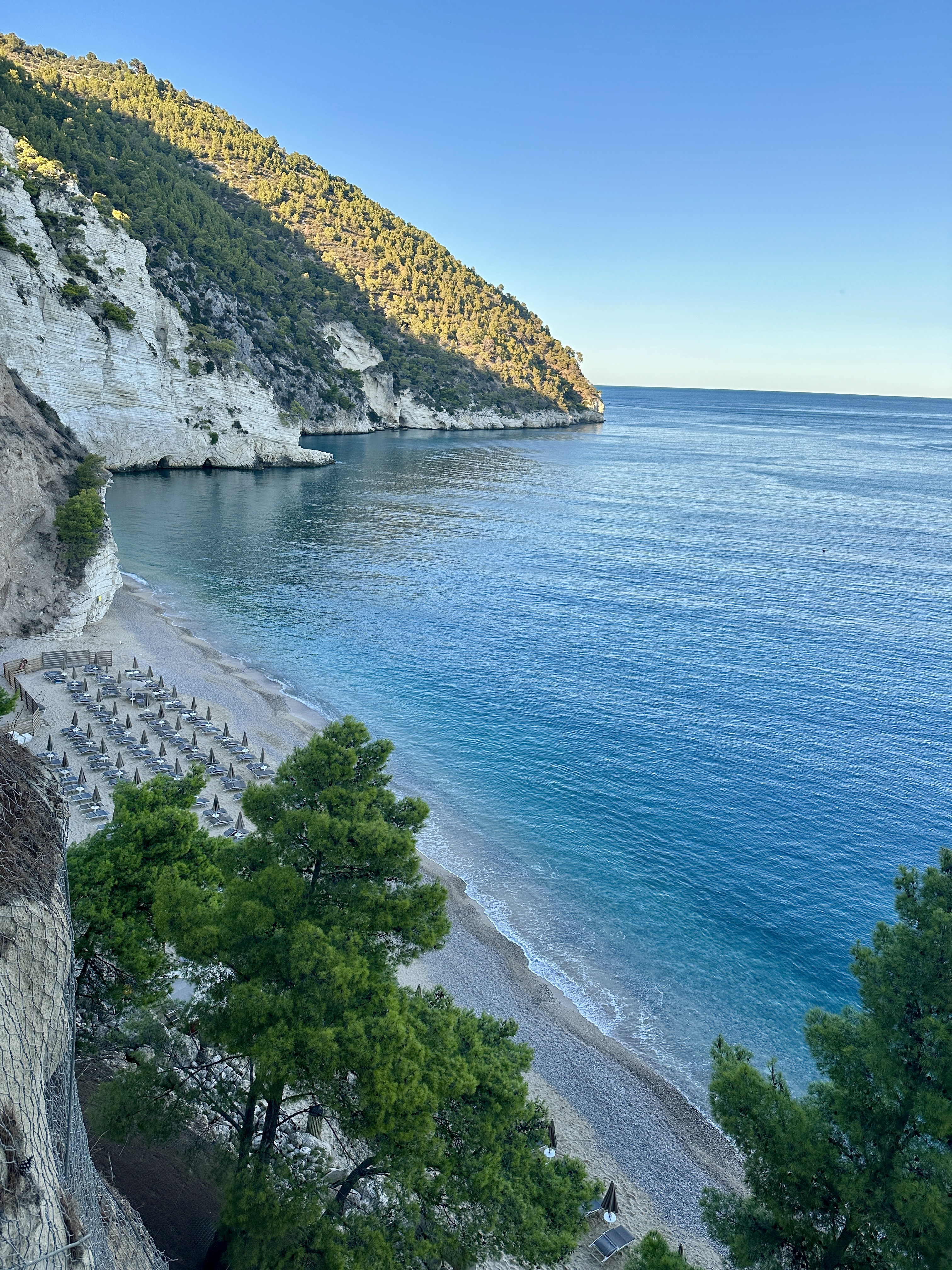Gegen Ende der Reise gönnen wir uns ein schönes Hotel an der Nordküste von Apulien. Hier ist das Wasser noch klarer, und die Landschaft mit den weissen Felsen ist atemberaubend. Unser Hotel verfügt über einen Privatstrand, den wir entweder per Treppe oder Lift erreichen können. Wir geniessen ein paar entspannte Badetage.