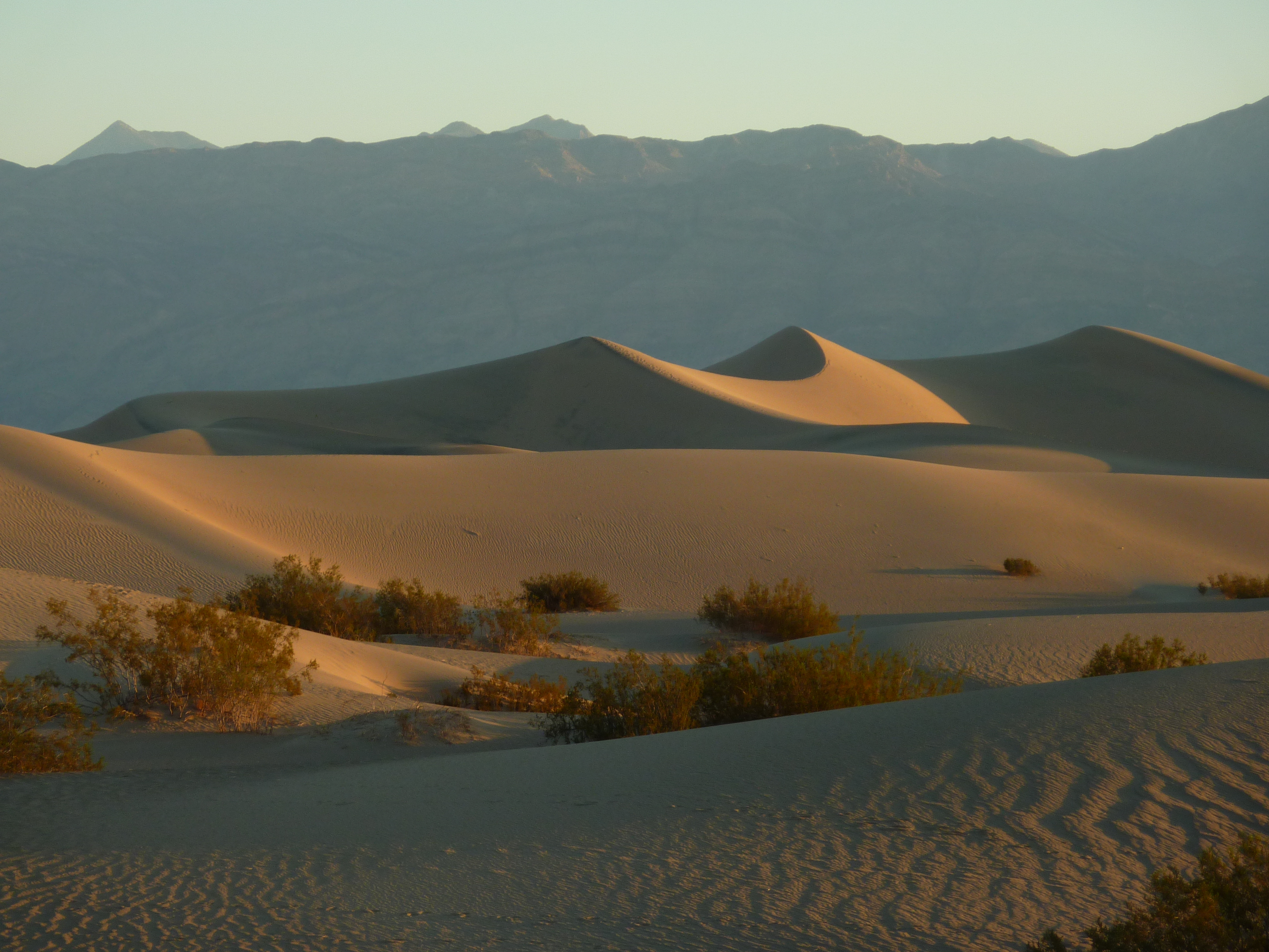 Der Sonnenaufgang ist spektakulär im Death Valley, Schattenwurf in den Dünen. Morgens ist die Temperatur angenehm. Von April bis Oktober liegt die durchschnittliche Tagestemperatur zwischen 30-46 Grad C.