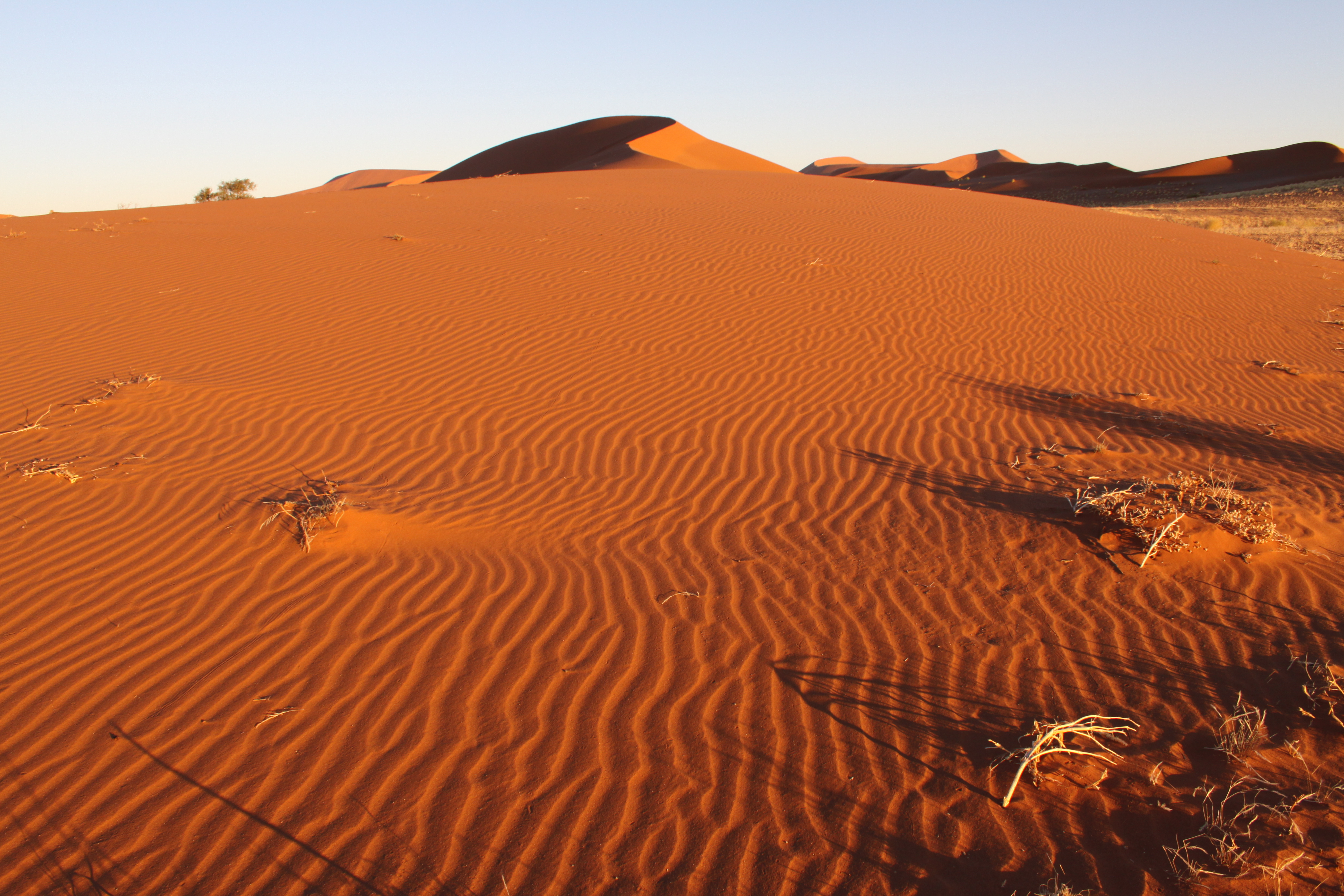 Ein relativ kleiner Teil der Kalahari liegt in Namibia. Der farbliche Kontrast zwischen dem roten feinen Sand und dem hellblauen Himmel verspricht einzigartige Fotosujets. In der Halbwüste zeigen die San-Buschmänner gerne mit viel Gesten und wenig Worten wie ihre Väter in der Kalahari überlebten. Die Bagatelle Kalahari Game Ranch Lodge und die Intu Afrika Lodge bietet dies den Gästen an.