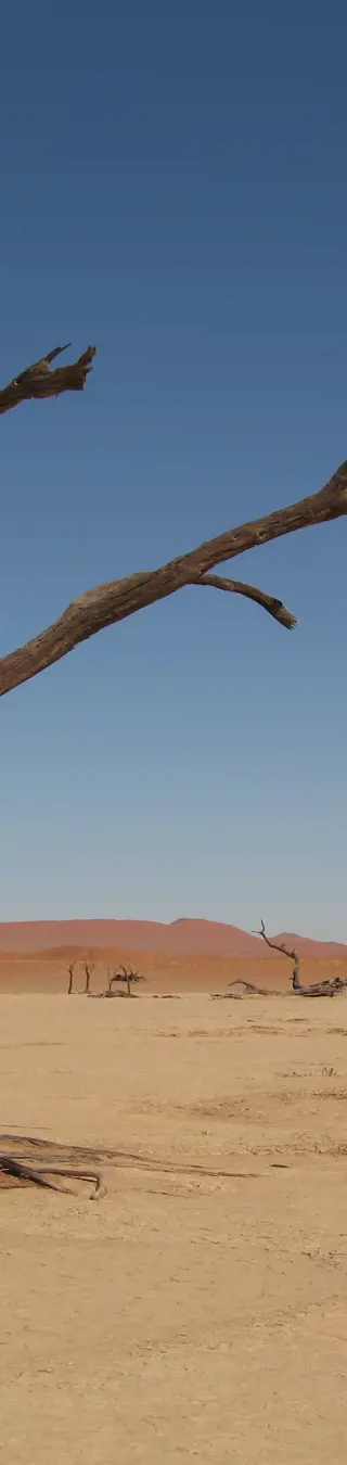 Deadvlei: Charakteristisch sind die vielen abgestorben Akazienbäume. Manche dieser Bäume sind über 500 Jahre alt. Im Südosten befindet sich der "Big Daddy" oder " Crazy Dune", eine der höchsten Sanddünen der Welt mit rund 350 m.
