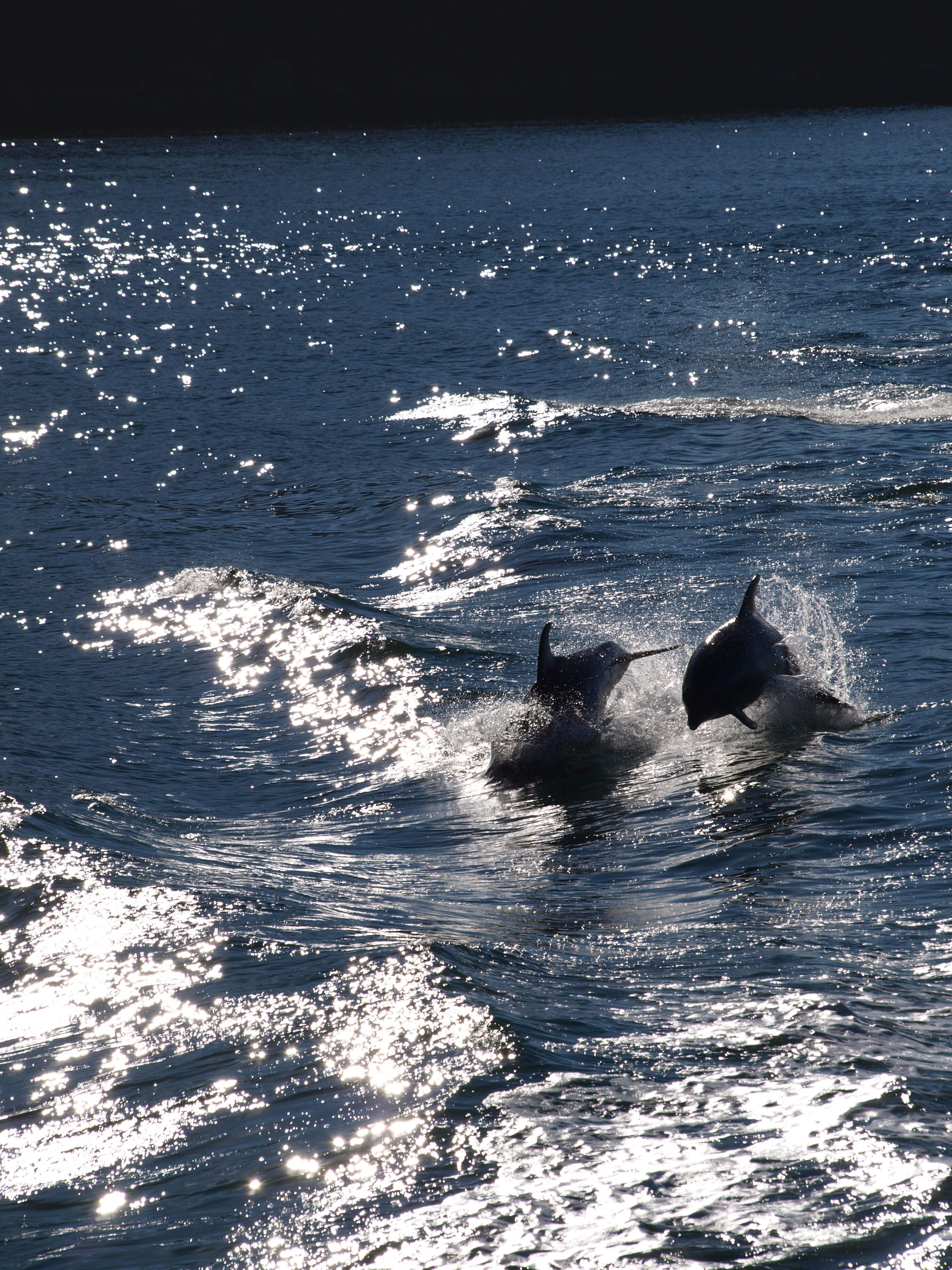 Da kommen sie! Kurz nach Sonnenaufgang tauchen am Strand von Monkey Mia Delfine auf, spielen eine ganze Weile vor unseren Augen im Wasser und verschwinden wieder im Ozean. Am anderen Morgen kommen sie wieder.