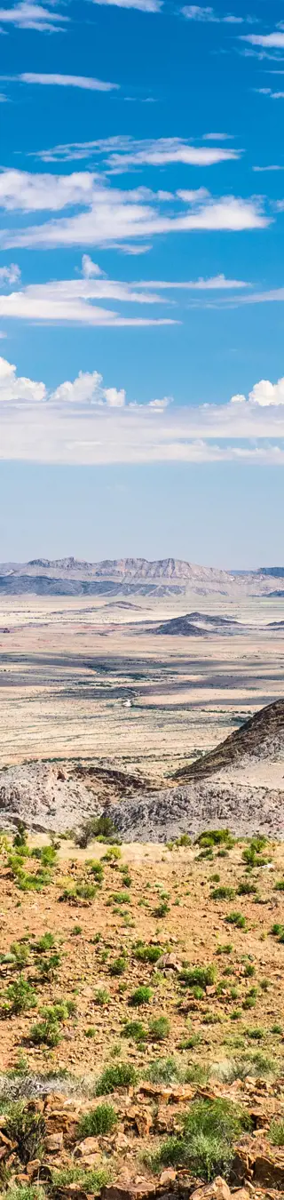 Die trockene und steinige Wüstenprärie reicht westlich von Twyfelfontein bis hin zur Skelettküste. Diese abgeschiedene Region ist Heimat einer Vielzahl von wilden Tieren – Zebras, Giraffen und das selten vorkommende schwarze Nashorn finden hier ihren Lebensraum.