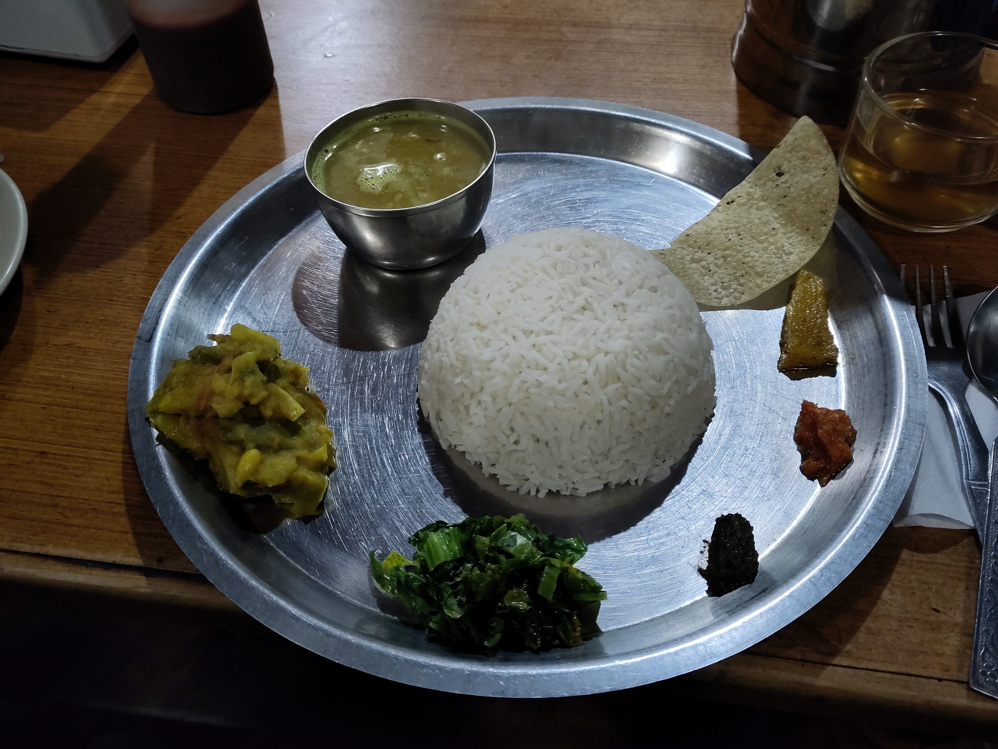 Unsere Guides und Träger essen täglich mindestens zwei Mal das Nationalgericht Dal Bhat, ein Menü mit Reis, Linsensuppe sowie unterschiedlichem Gemüse und Papadam. Traditionellerweise wird das Gericht ohne Besteck verspeist, nur mit der rechten Hand. Wir bevorzugen etwas Abwechslung bei den Köstlichkeiten und geniessen oft auch Nudelgerichte oder Momos mit lokalem Brot.