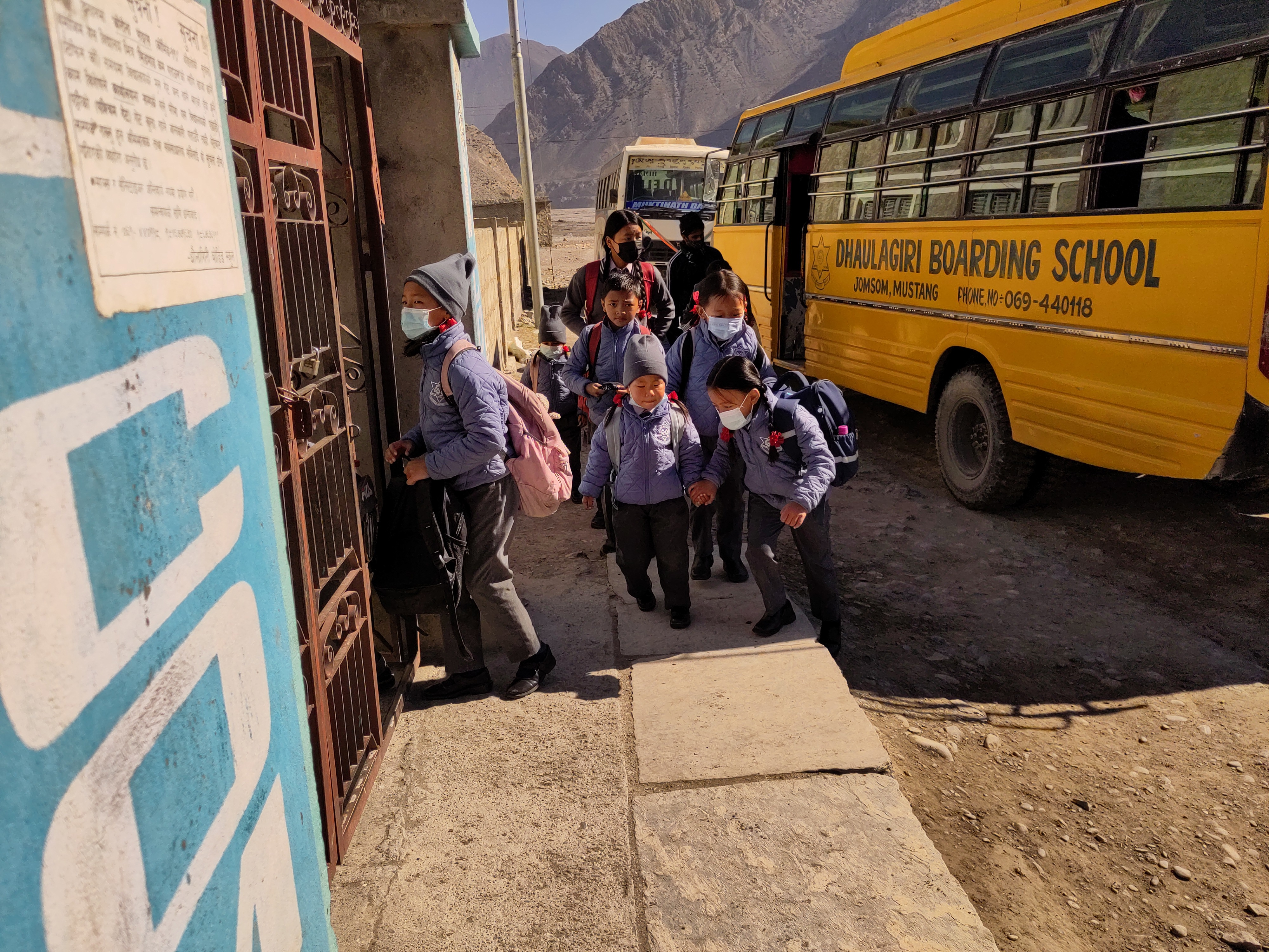 Ganz unerwartet folgen uns am Sonntagmorgen kurz vor zehn Uhr unzählige Schulkinder bis zum Dorfrand von Jomsom. Wir werden freundlich gegrüsst und können der Schule einen kurzen Besuch abstatten. Der Schulleiter erklärt uns vor dem Morgenritual, das mit allen Schülern und Schülerinnen im Innenhof abgehalten wird, dass die Kinder hier jeweils sechs Stunden pro Tag von Sonntag bis Freitag zur Schule gehen würden und dass der Sonntag ihr Wochenstart sei.