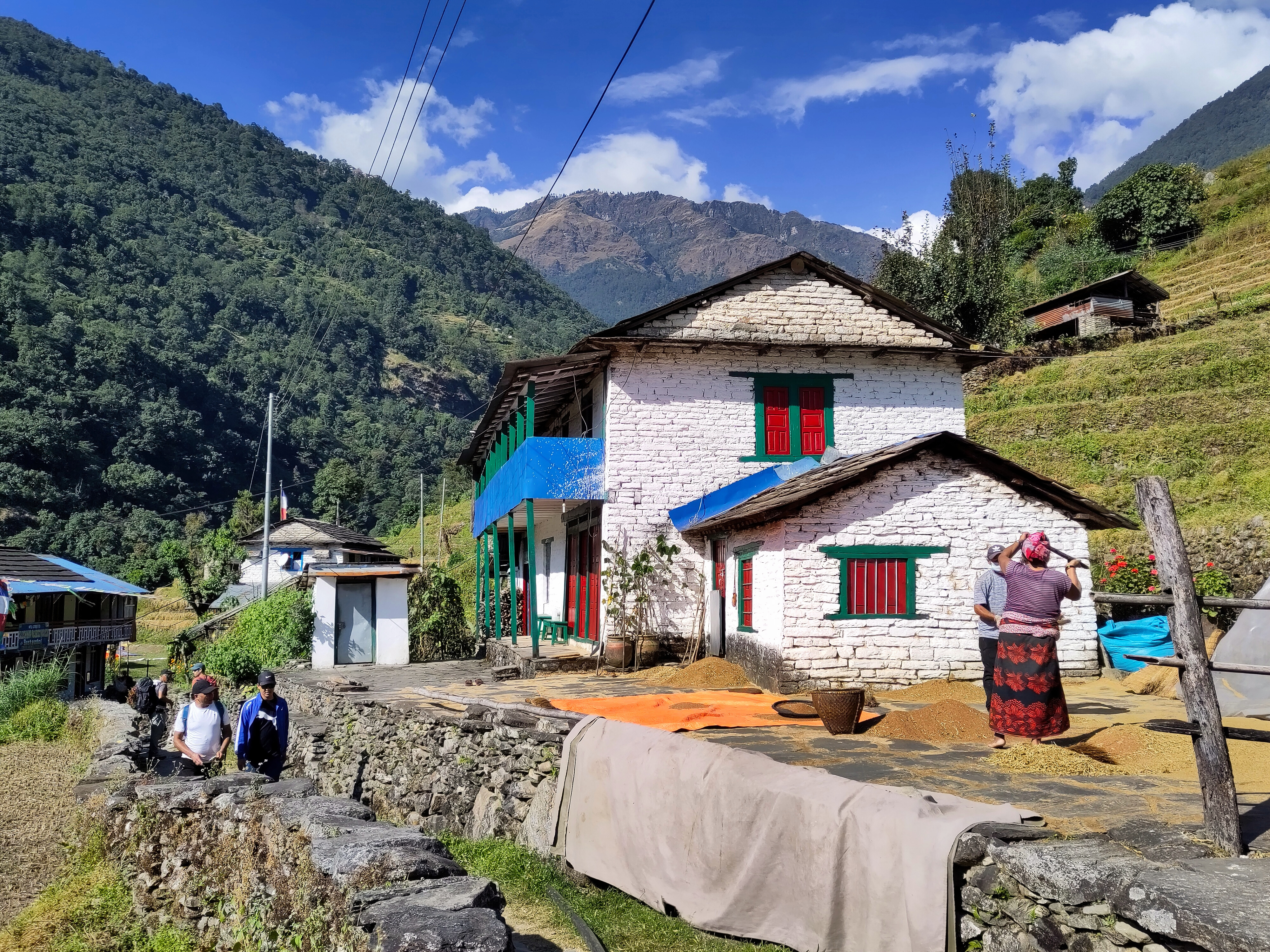 Bei sonnigem und überraschend warmem Herbstwetter startet unsere Tour etwa drei Stunden ausserhalb von Pokhara. Zunächst geht es gemächlich aufwärts. Während der ersten Tage wandern wir oft auf den berühmten nepalesischen Treppen. Dabei kommen wir an Reis- oder Hirsefeldern vorbei und können die Bauern bei der Ernte und dem Trocknen diverser Nahrungsmittel beobachten.