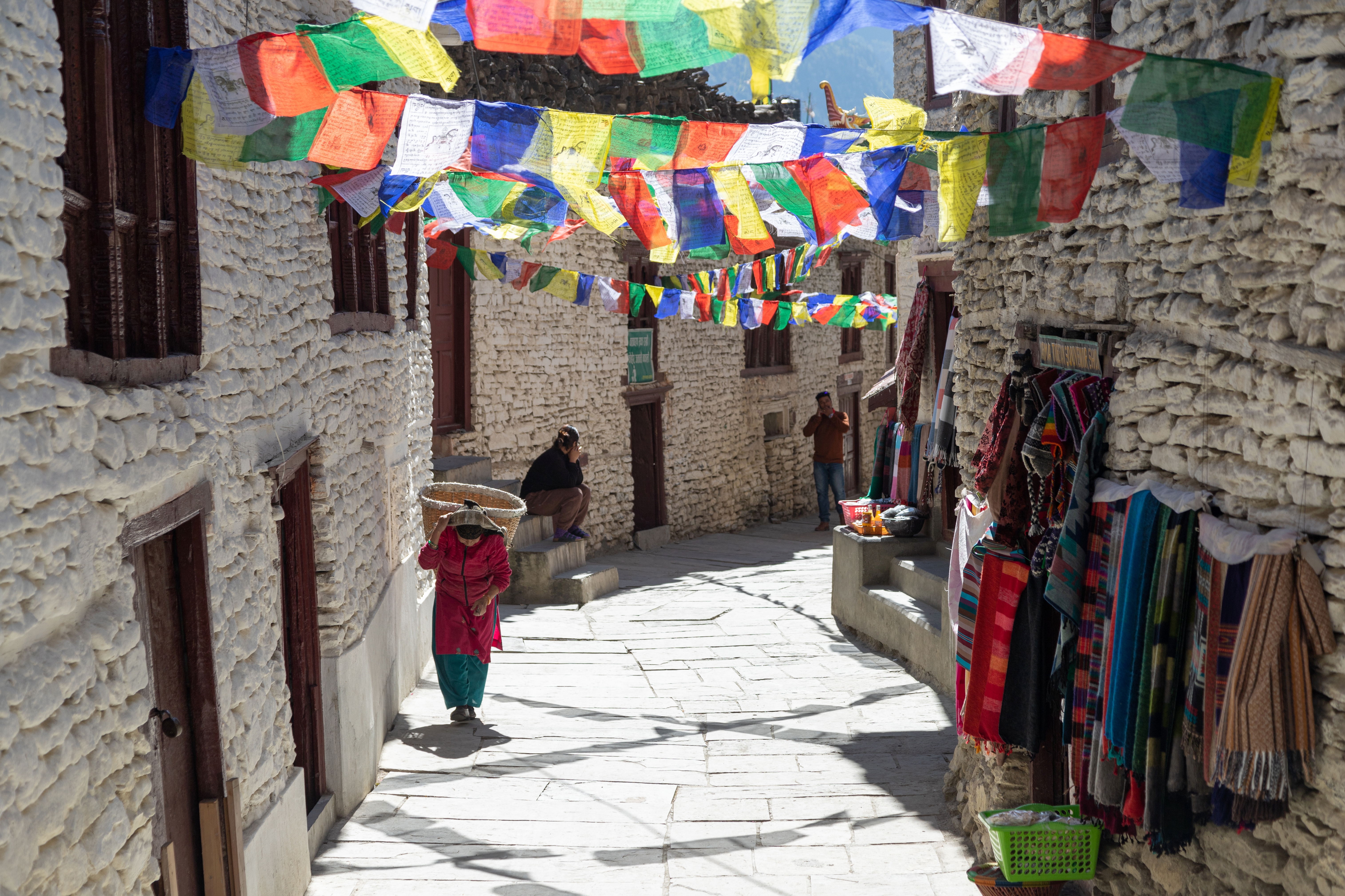 Mit kleinen Gassen, buddhistischen Gebetsfahnen und hübschen Steinhäusern ist das kleine Dorf Marpha eine willkommene Oase für uns. Auf den Dächern trocknen neben Holz überall unzählige Apfelringe, welche wir als weitere Trekkingnahrung ebenfalls kaufen. Als uns die Gastgeberin unserer Unterkunft zudem einen frischen Apfelkuchen anbietet, ist unser Tag perfekt – und die halsbrecherische Busfahrt ist beinahe schon vergessen.