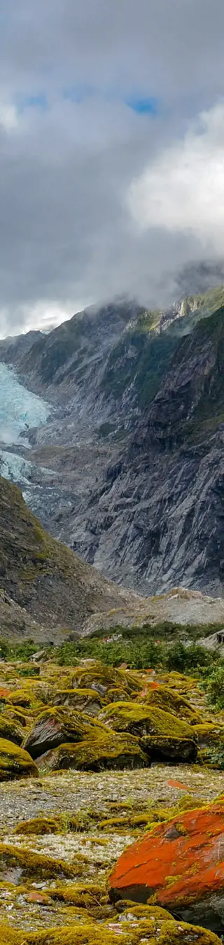 Die Fox und Franz Josef Gletscher liegen im Westland Nationalpark, 25 km von einander entfernt. Sie werden oben in den Bergen von Eis gespiesen, am unteren Ende sind sie von Regenwald umgeben. Beide bewegen sich mit hoher Geschwindigkeit voran (Franz-Josef 0.5 m pro Tag, Fox 1 m pro Woche).