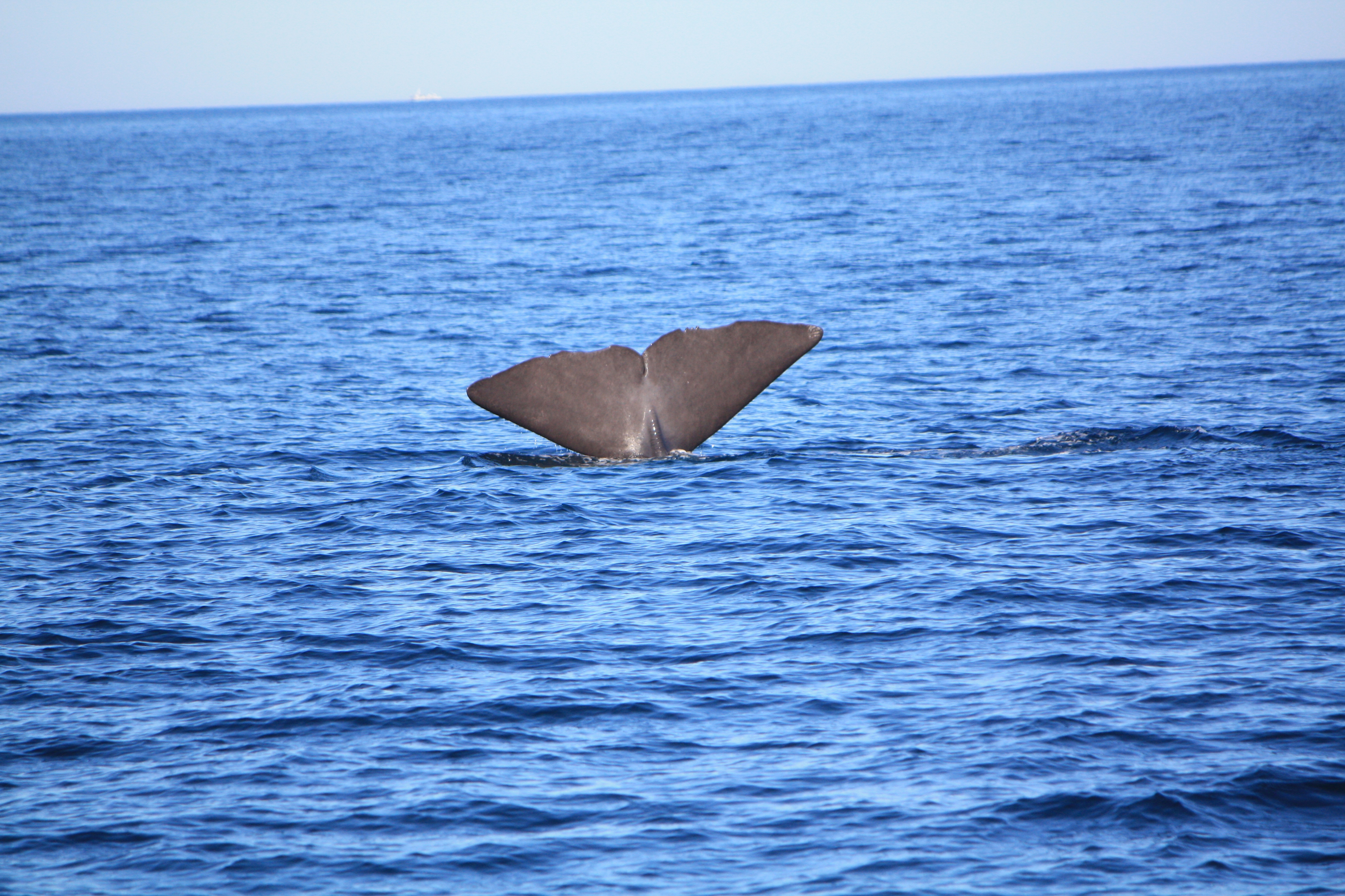 Dann endlich geht es aufs Boot. Wir sind auf einem etwas grösseren, bequemen Boot unterwegs und tuckern daher langsam übers Meer. Schon bald hören wir über Lautsprecher, dass kurz vor uns Grindwale gesehen wurden. Und siehe da: kurze Zeit später sehen wir die kleinen Wale, die an Delfine erinnern, in der Nähe des Boots durchs Meer flitzen. Wir sind noch ganz begeistert, und schon hören wir, dass in der Nähe auch ein Pottwal-Männchen zu sehen ist. Dieses verabschiedet sich aber schon von weitem mit einem letzten sichtbaren Blas, bevor beim Untertauchen nur noch die Schwanzflosse zu sehen ist. Wir beschliessen zu warten – und siehe da: kurze Zeit später taucht der 15-Meter-Koloss wieder auf und zeigt sich in voller Grösse. Wir sind sprachlos!