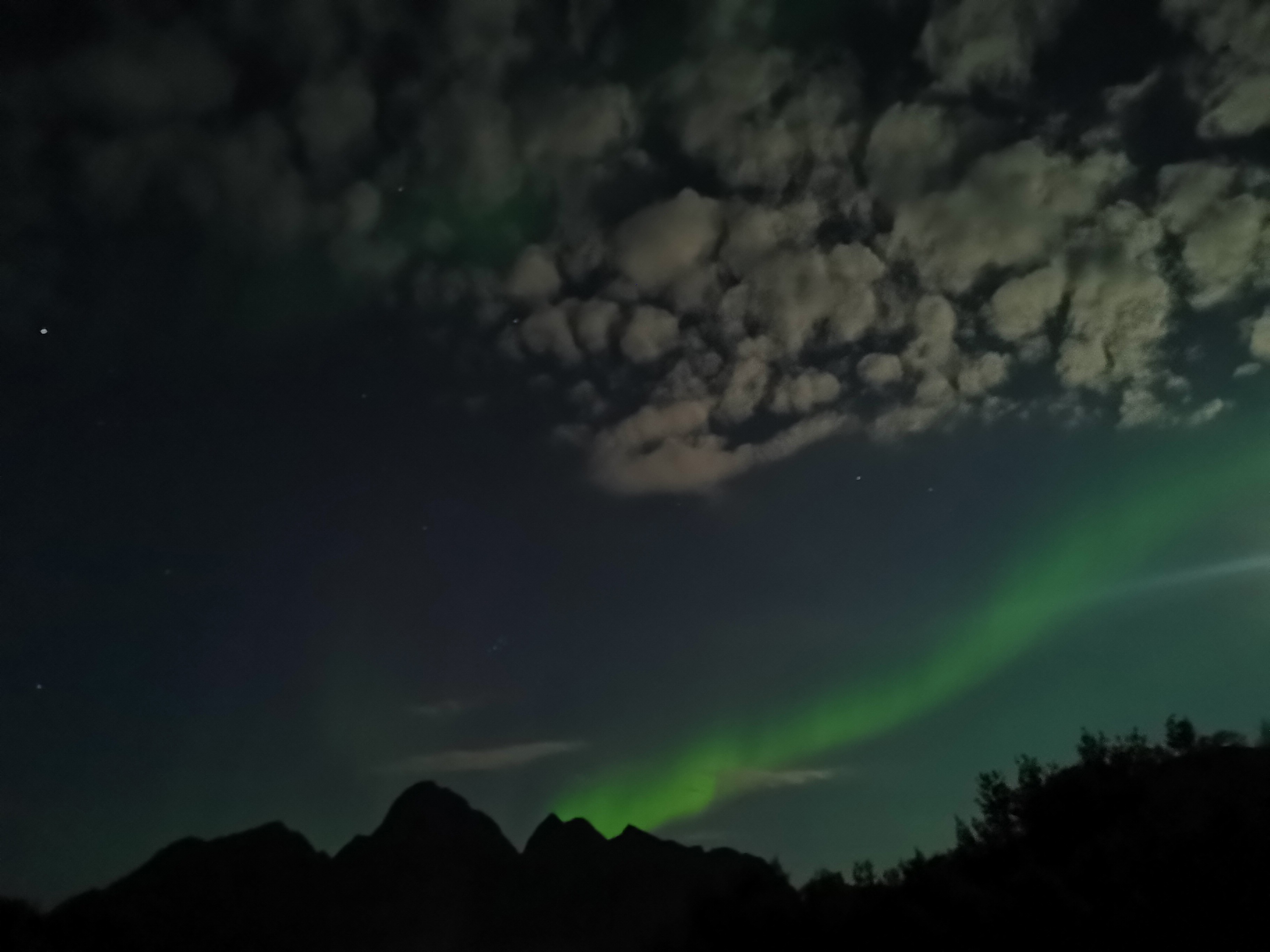 Auf der Suche nach einem Ort mit weniger Licht, wo wir die Nordlichter noch besser sehen können, fahren wir sogar nochmals aus der Stadt hinaus. Als wir in der kompletten Dunkelheit ankommen, sind sie aber schon schwächer und verschwinden kurz darauf hinter der ankommenden Bewölkung.