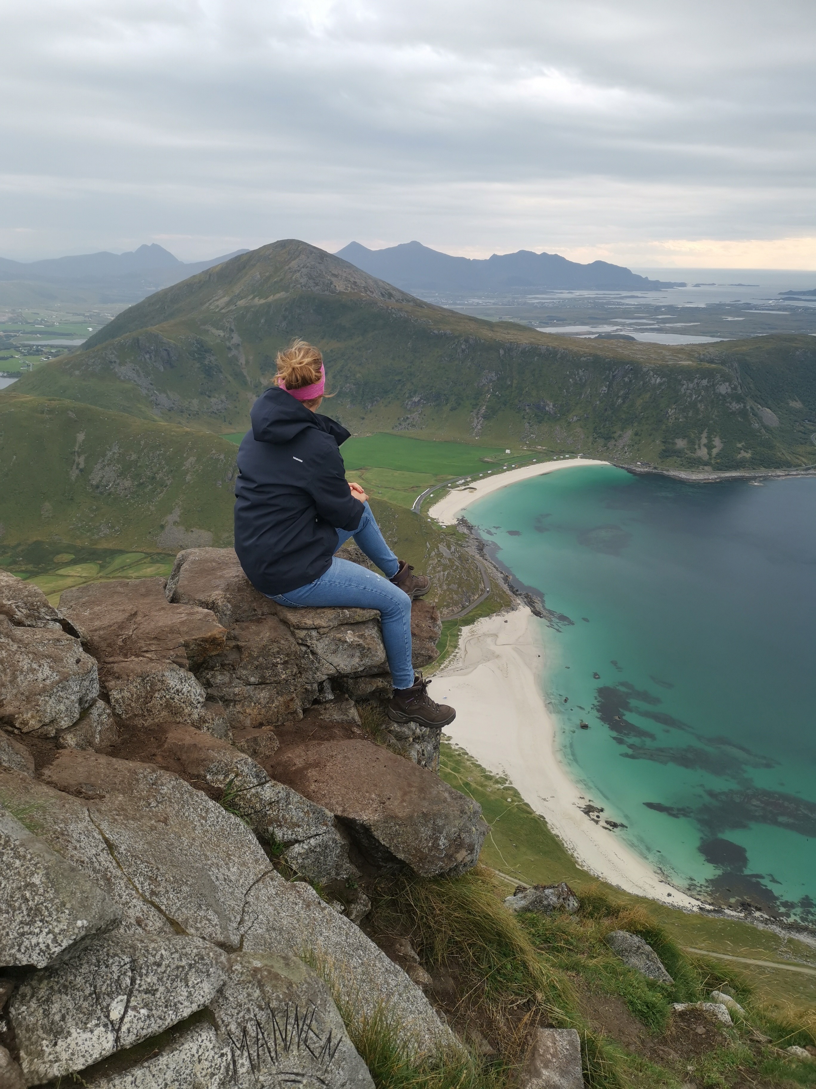 Nachdem wir den extrem steilen Aufstieg auf den Reinebringen von der Strasse aus gesehen haben, suchen wir nach einem etwas weniger anspruchsvollen Wanderziel. Wir merken aber schnell, dass Wandern auf den Lofoten ganz oft «steil bergauf und -runter» bedeutet. Wir lassen uns nicht entmutigen und parkieren kurz darauf unser Mietauto auf dem grossen Parkplatz, um den Mannen (400 m ü. M.) zu besteigen. Die Strecke ist kurz, aber steil und ein bisschen rutschig. Doch schon nach 50 Minuten stehen wir auf dem Gipfel und werden mit einer einzigartigen Aussicht belohnt.
