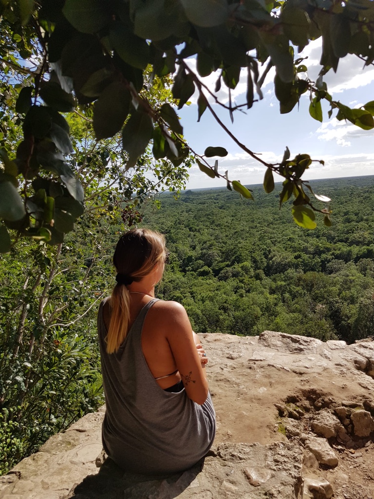 Anders wie bei den meisten Maya-Ruinen, dürfen wir in Cobá bis zum obersten Punkt steigen. Von oben geniessen wir eine Top-Aussicht über die Gegend und den Dschungel. Das Wetter ist übrigens warm und angenehm.