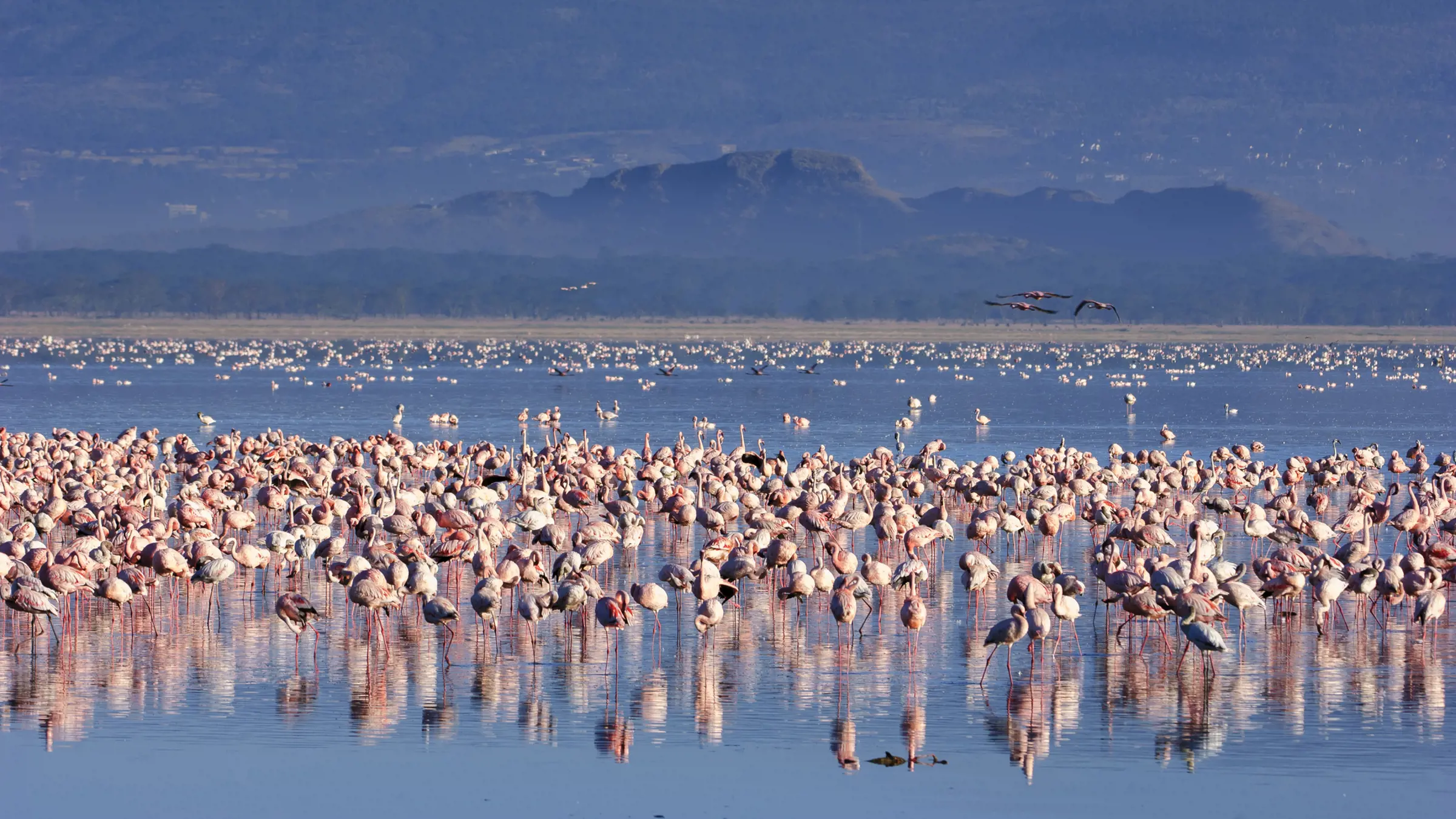 Flamingos gefällig? Kein Problem im Lake Nakuru Nationalpark. Wenn hunderttausende Vögel das Ufer des Sees bevölkern und sich gleichzeitig in die Luft erheben, erlebst du eine ganze «rosa Wolke» aus Flamingos!