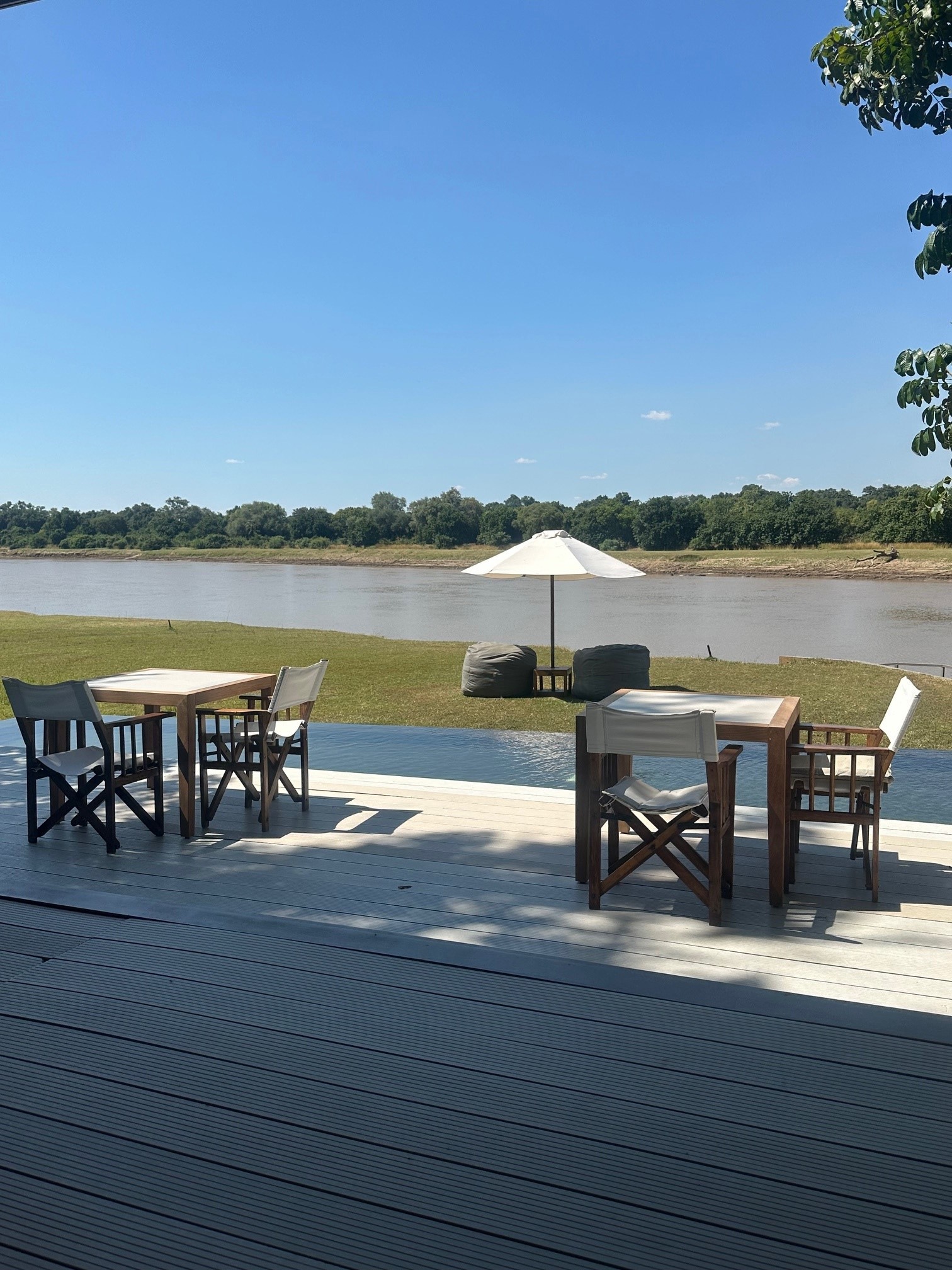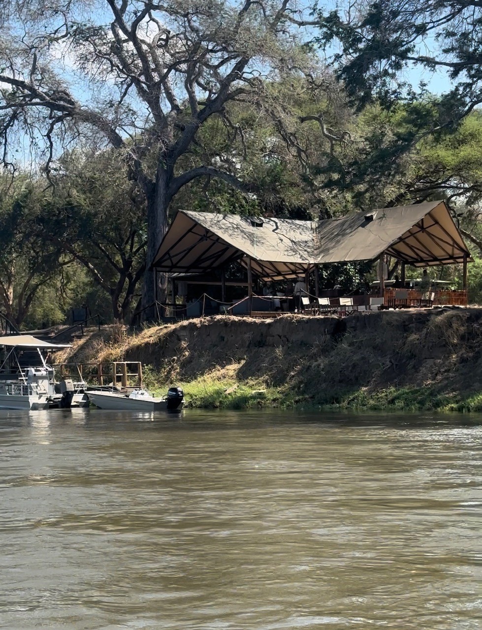 Nach der Landung im South Luangwa Nationalpark werden wir von unserem Fahrer abgeholt. Nach einer Fahrt von zirka 40 Minuten erreichen wir das Flussufer des South Luangwas. Wir nehmen das Boot für die Überquerung und erreichen die schöne Lodge von Time and Tide Chinzombo mit wunderschönem Blick über den Fluss.