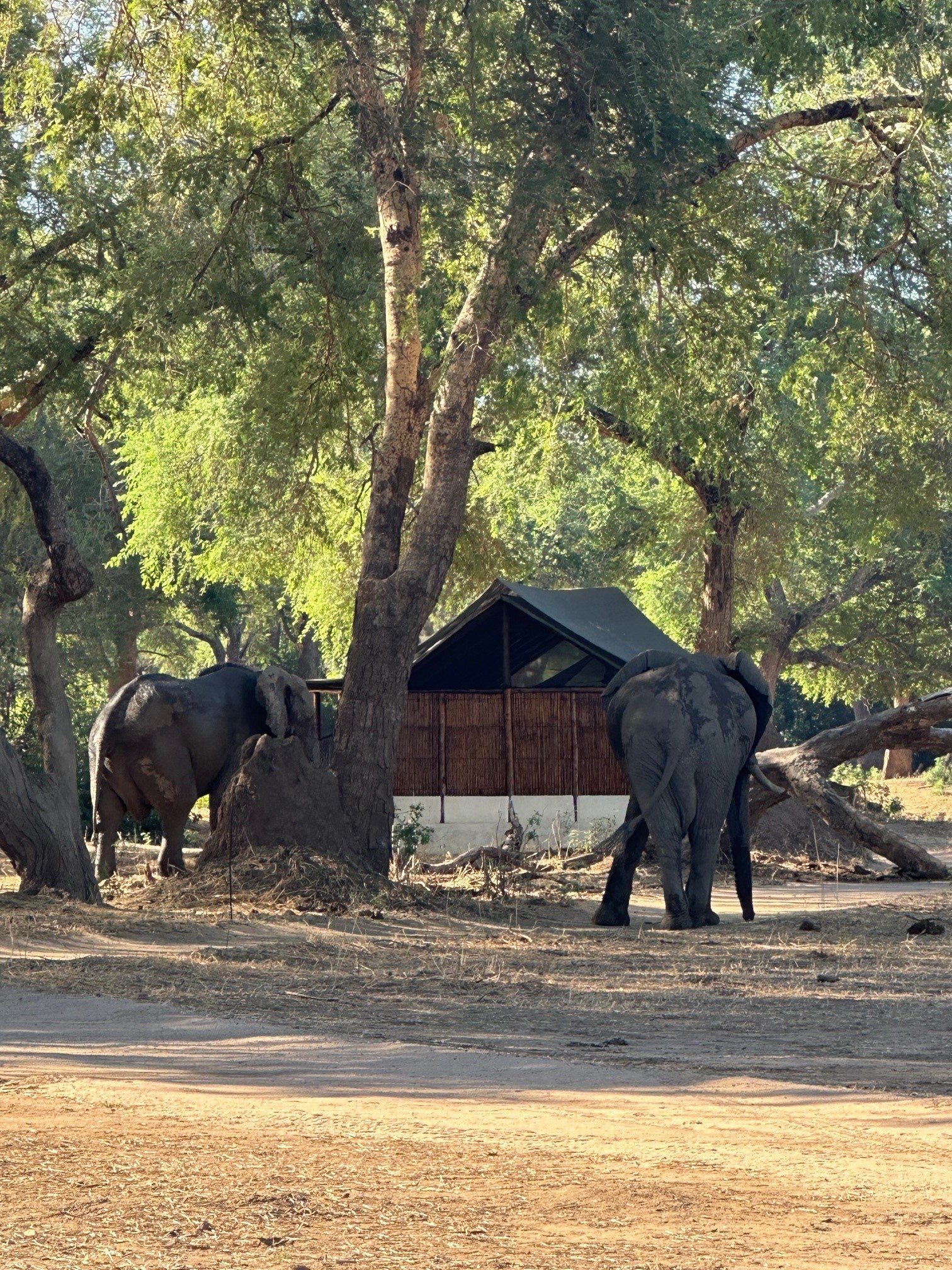 Das Old Mondoro Camp ist ein klassisches Buschcamp mit relativ einfachen, rustikalen Zimmern, die aber sehr geräumig und mit Liebe zum Detail dekoriert sind. Die Zimmer sind gegen den Fluss beziehungsweise gegen die Lagune hin offen, durch eine Art Westerntüre gelangt man auf die ebenerdige, schattige Veranda, wo ein kleines Sofa und Stühle zum Verweilen und Beobachten einladen – vor allem Elefanten sind oft neugierige Besucher bei den Zimmern, sie sind jeden Tag rund ums Camp zu finden.