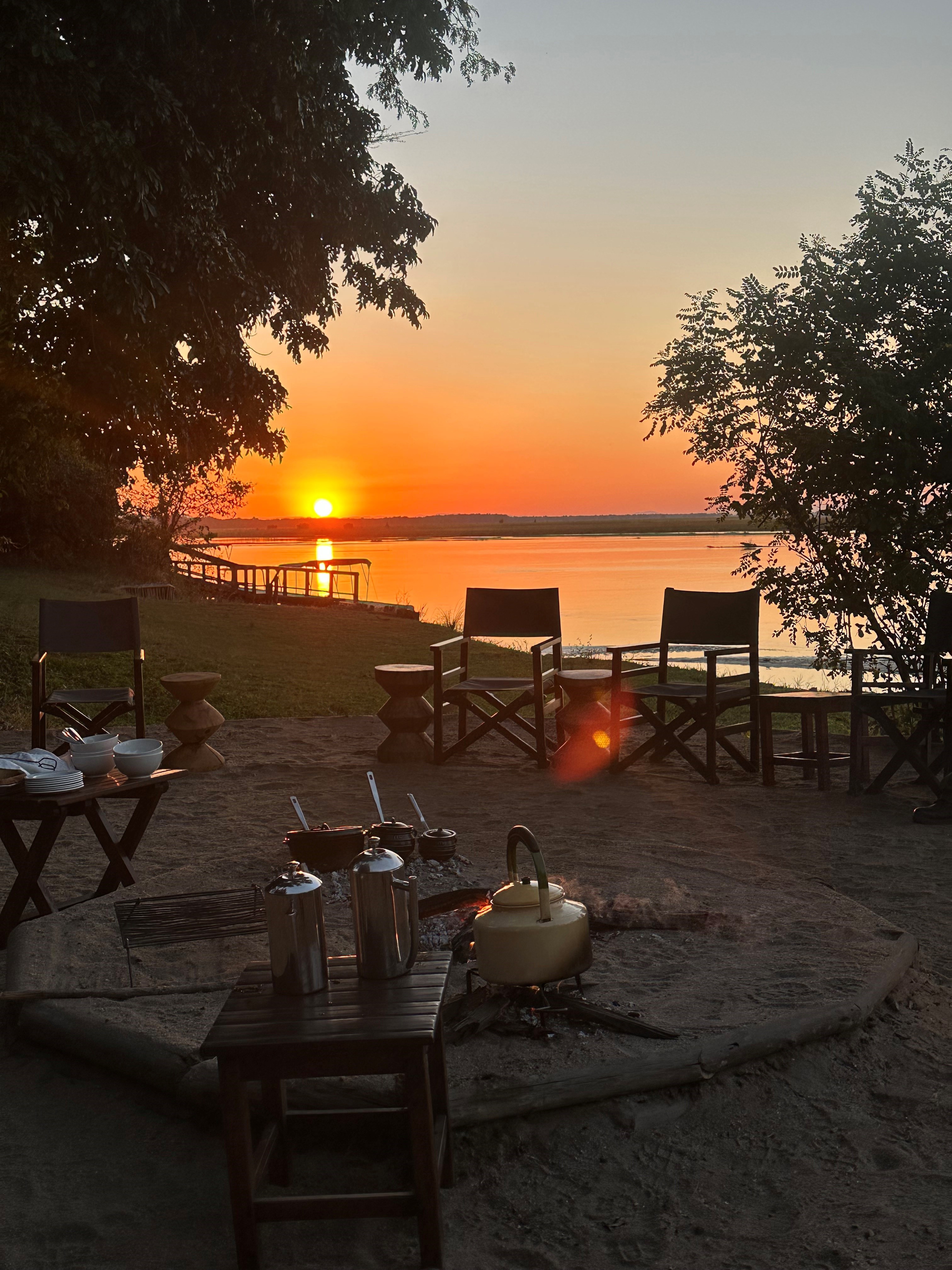 Das Chiawa-Camp liegt innerhalb des Lower Zambezi Nationalparks. Dieser liegt im Südosten Sambias, gegenüber des Mana Pools Nationalparks in Zimbabwe, und erstreckt sich über 120 Kilometer entlang des Zambezi-Flusses. Jeden Morgen nehmen wir unser Frühstück am Lagerfeuer des Camps direkt am Zambezi-Fluss ein und beobachten den Sonnenaufgang über dem Zambezi River.