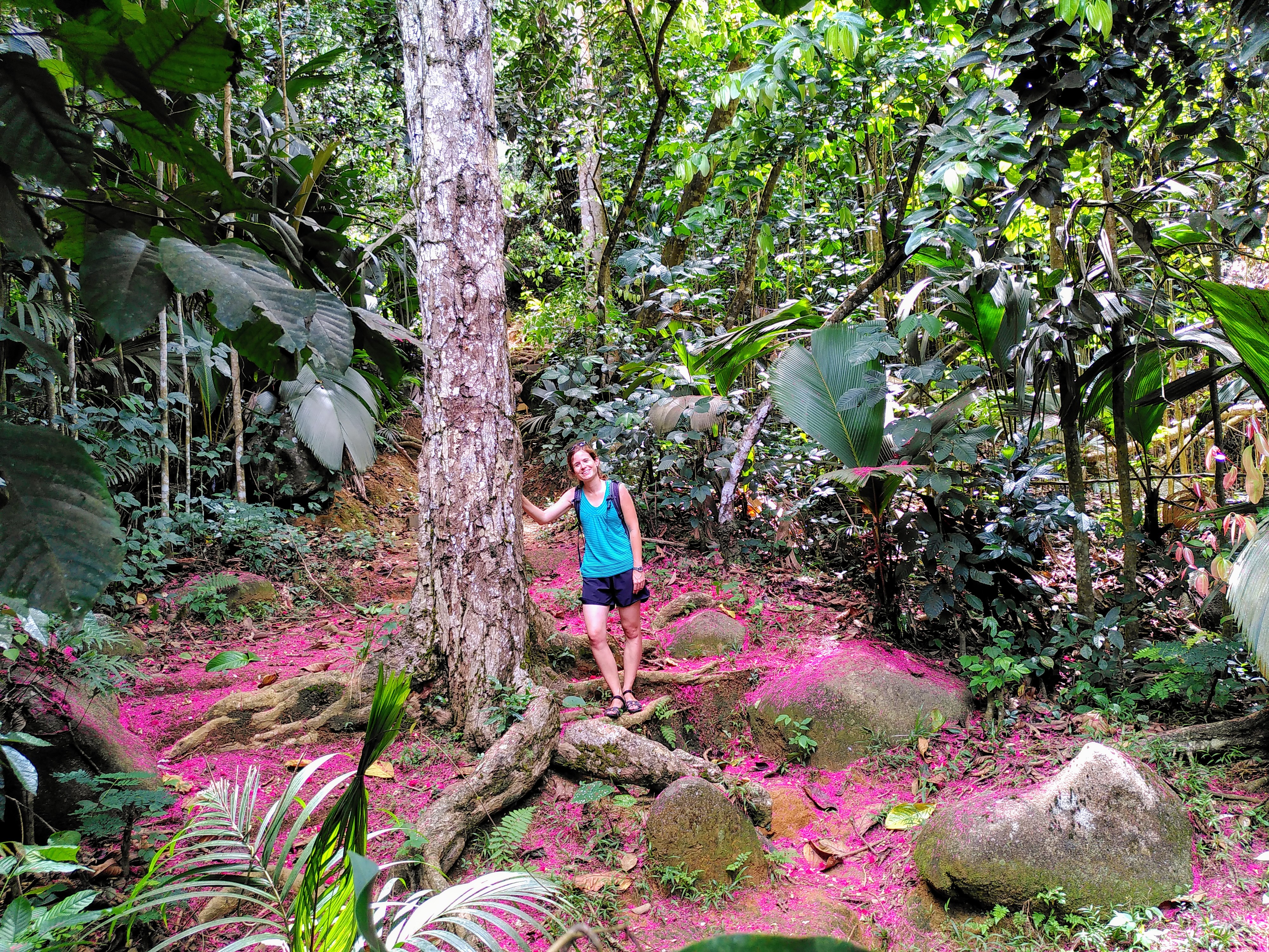 Auf einer Dschungelwanderung stehen wir plötzlich auf einem rosafarbenen Blütenteppich. Wir erfahren, dass es sich dabei um die Blüten eines lokalen Apfelbaums handelt.