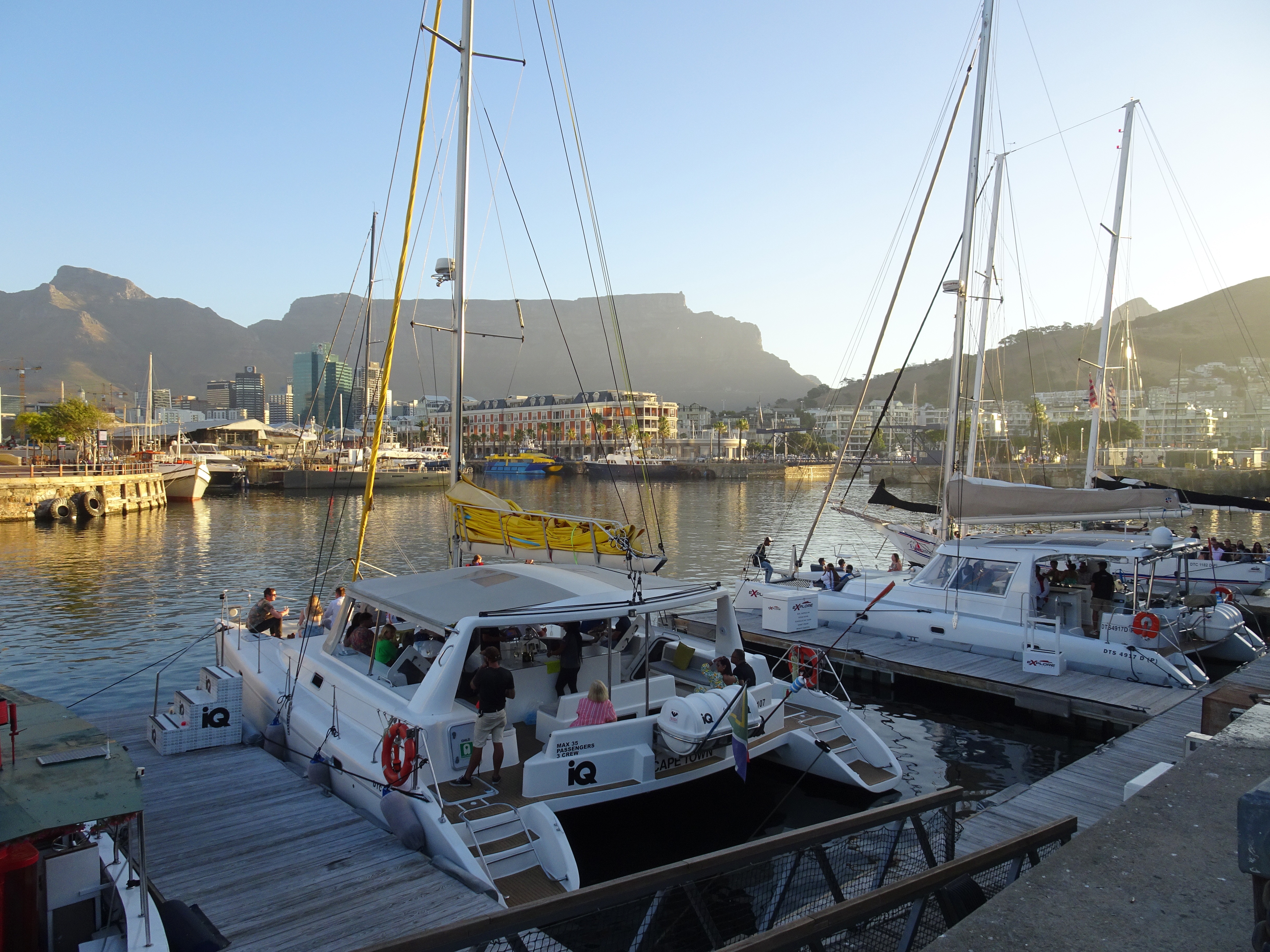 Entlang der Waterfront in Kapstadt reihen sich Shops und Restaurants aneinander. Wir lassen unseren Abend hier im Hafen bei einem guten Abendessen und einem Drink ausklingen und geniessen den schönen Sonnenuntergang.