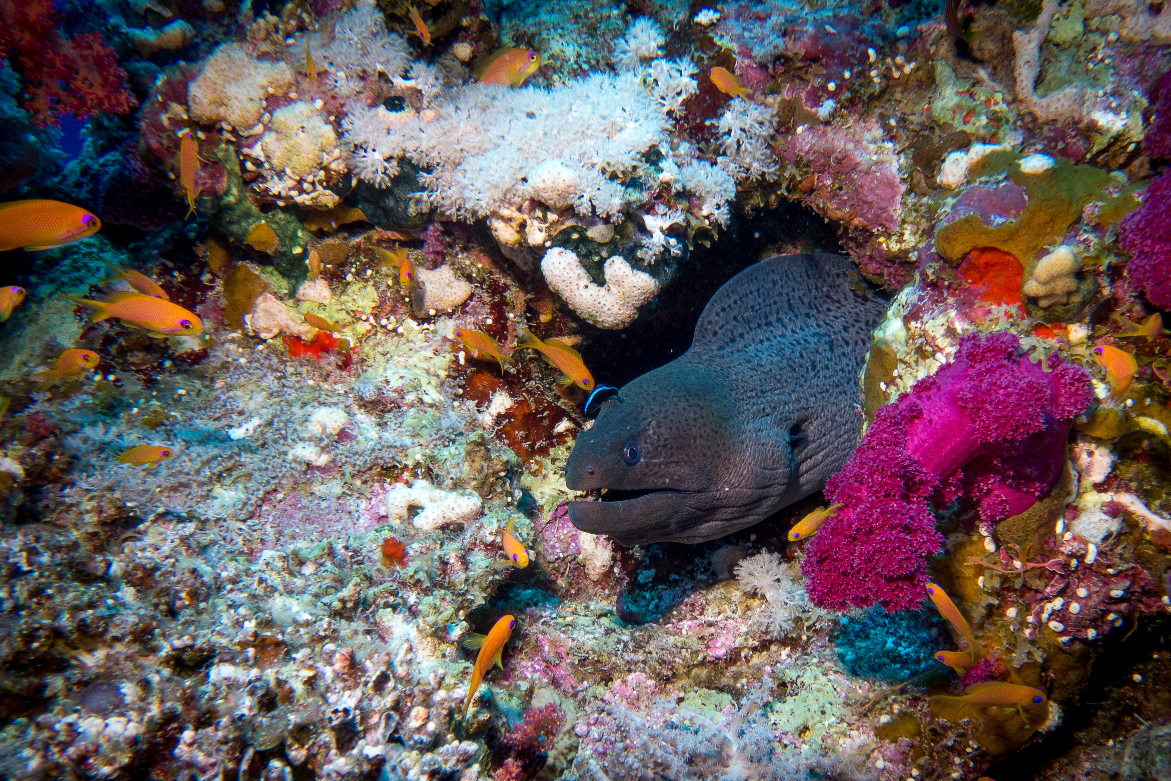 Muränen sieht man beinahe bei jedem Tauchgang. Die grösste Chance, mehr als nur den Kopf zu sehen, hat man am frühen Morgen, denn sie jagen vorzugsweise in der Dämmerung.