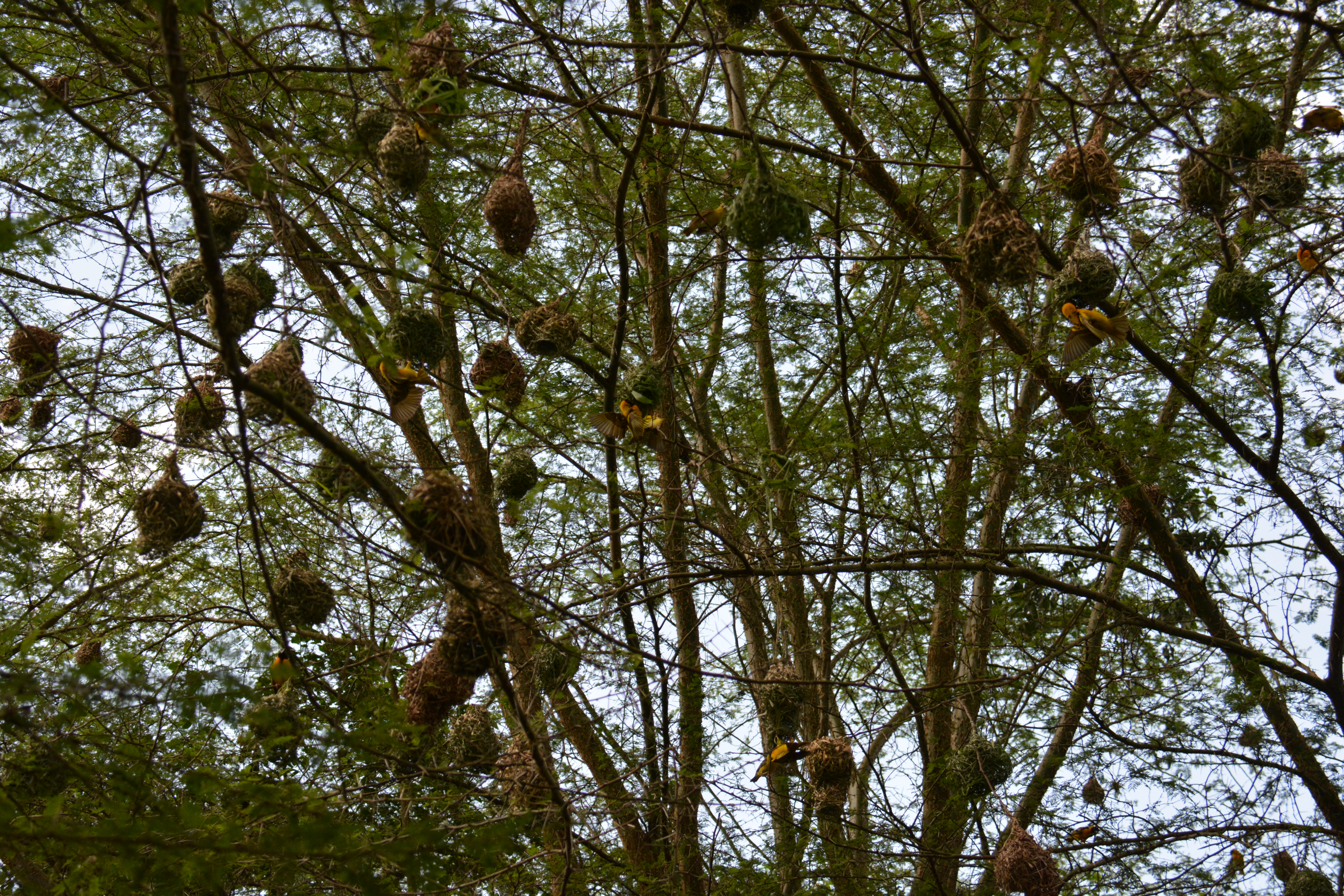 Was für ein ohrenbetäubendes Gezwitscher! Ich stehe unter einem Baum, wo hunderte Webervögel-Männchen Nester für ihr Weibchen bauen. Wenn das Nest der Vogeldame nicht gefällt, machen sie die Arbeit des Männchens in Kürze zunichte. Für den Vogel-Mann heisst das, nochmals von vorne beginnen – bis das Nest der Dame gefällt.
