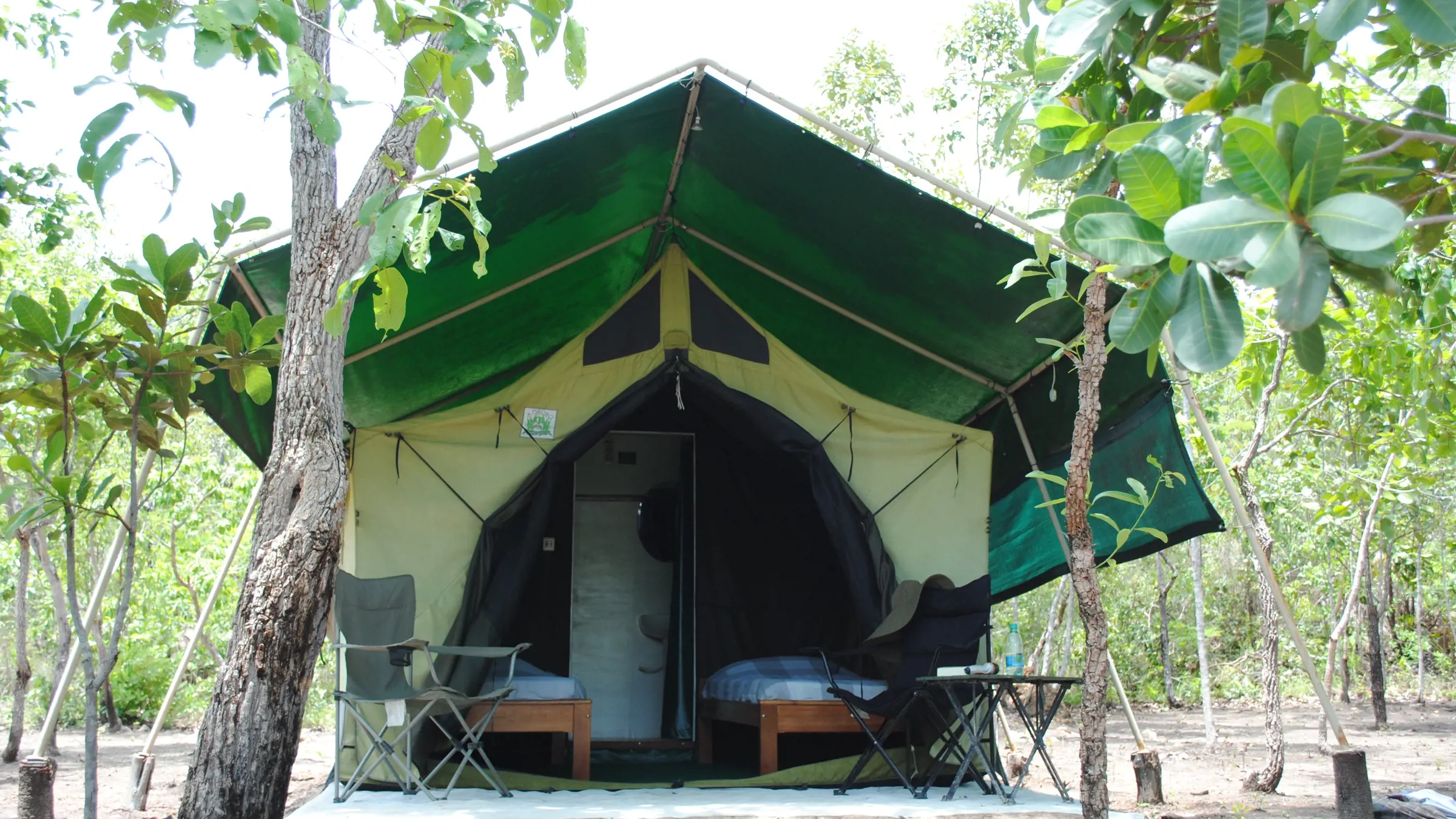 Die komfortablen Doppelzelte verfügen über zwei Einzelbetten, WC und fliessend Wasser, Duschen mit warmem Wasser in separatem Gebäude. Ebenso bietet das Camp ein Restaurant, ein Aufenthaltszelt mit Hängematten und einen Badestrand.