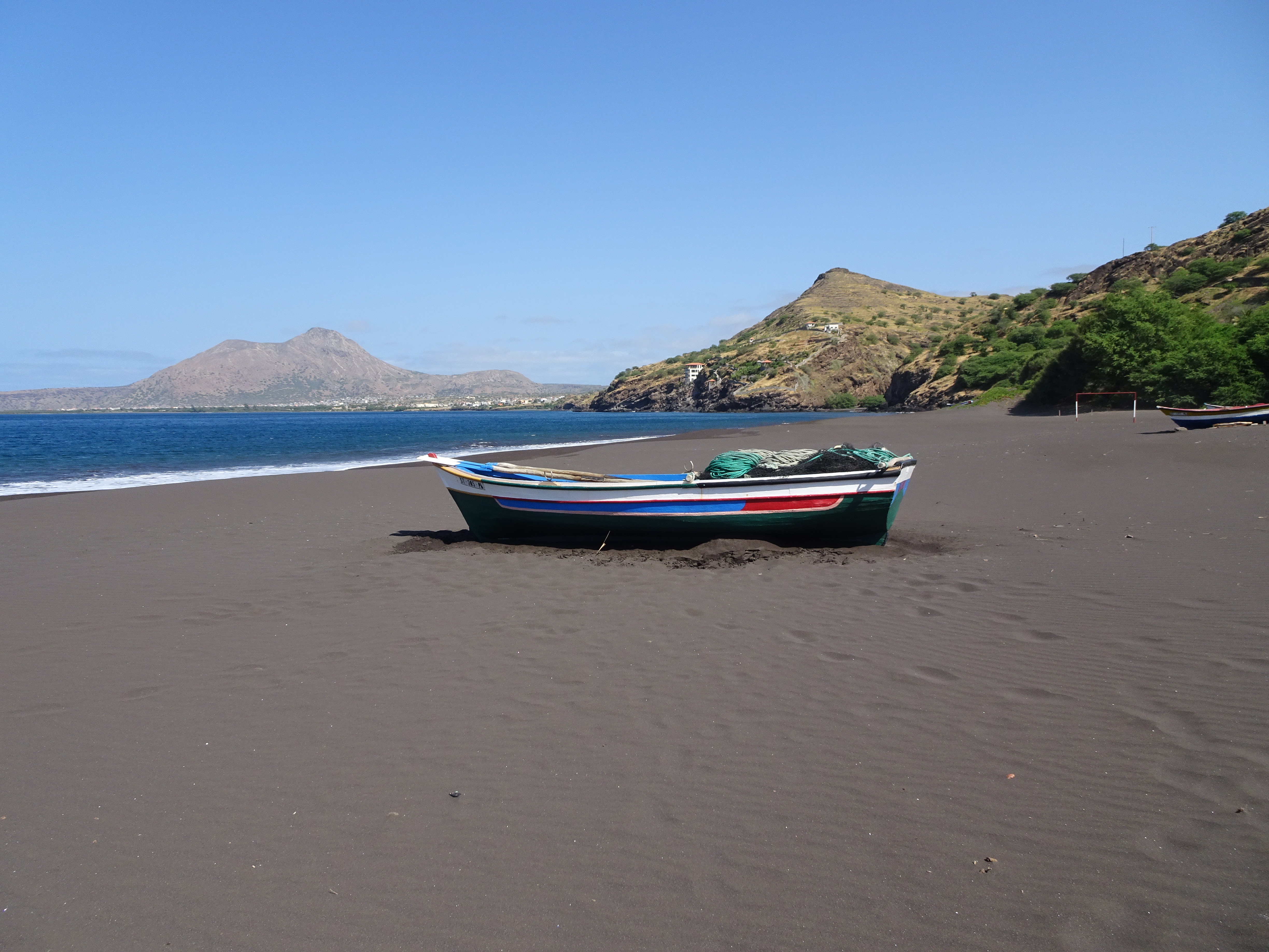 Auf den vulkanisch geprägten Inseln findet man Strände in allen Farben. Einen besonders schönen mit feinem, schwarzem Sand und ruhigem Meer finden wir auf Santiago. Kaum angekommen, wird uns eine frische Kokosnuss angeboten – so lässt sich das Inselleben geniessen.