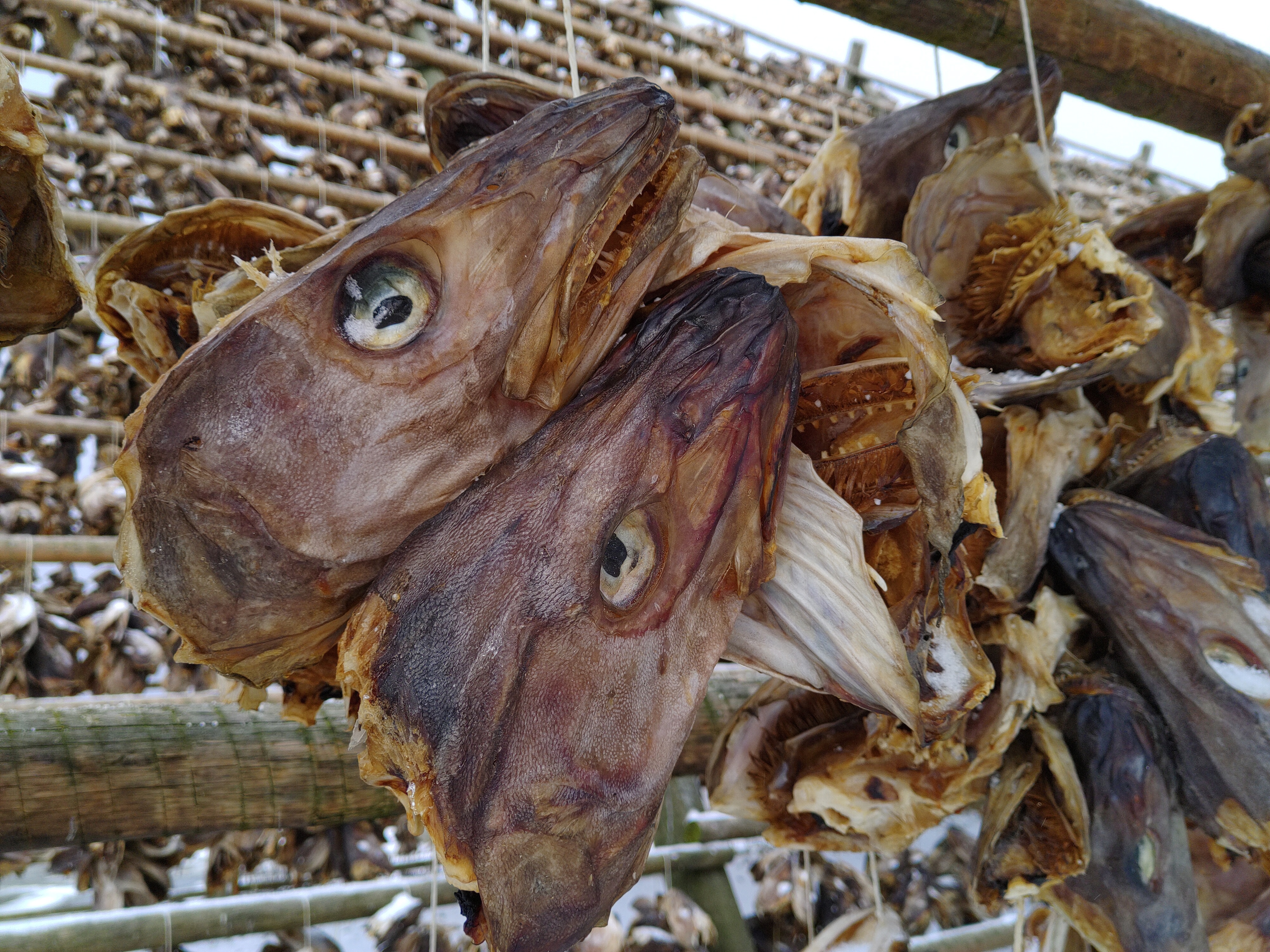 Bis im Mai ist im Norden von Norwegen Stockfisch-Saison. Die Fische hängen überall zum Trocknen an Holzgestellen, eine alte Methode zum Konservieren. Der Fisch riecht man schon von Weitem – interessant, aber nichts für heikle Mägen.