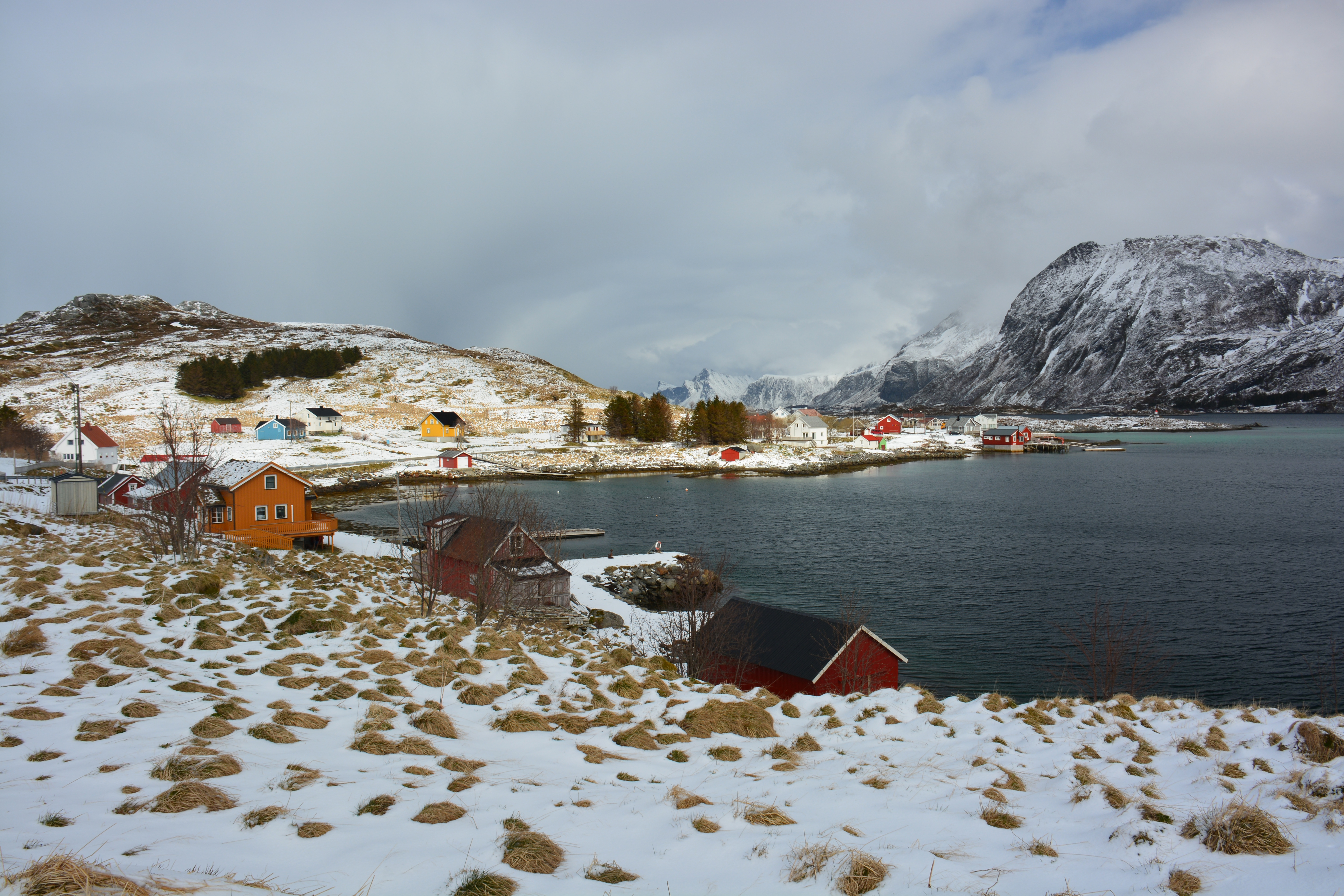 Guten Morgen von den Lofoten. Über Nacht hat es geschneit, und wir erwachen in einer Wintermärchenlandschaft. Viele alte Fischerhütten, sogenannten Rorbuer, wurden zu Unterkünften umgebaut.